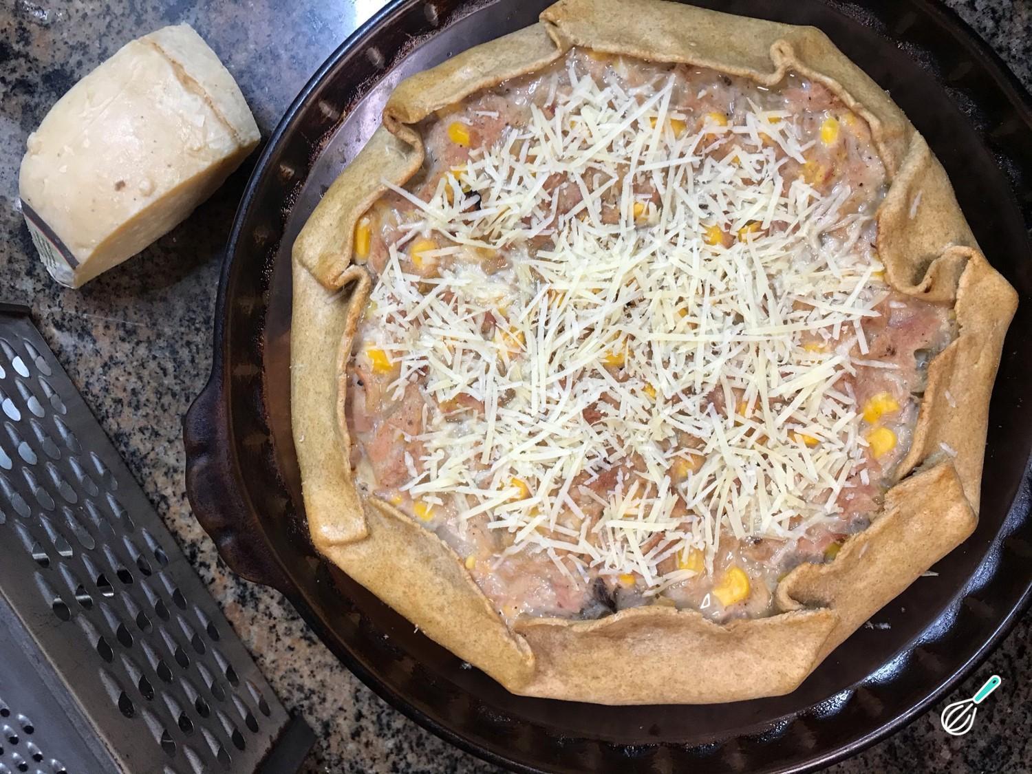 Após esses minutos, se quiser, pode adicionar queijo ralado e levar novamente ao forno para gratinar. Isso fará com que você obtenha uma torta cremosa de atum fit que fica ainda mais deliciosa pela combinação de texturas (o queijo crocante com o milho cremoso).