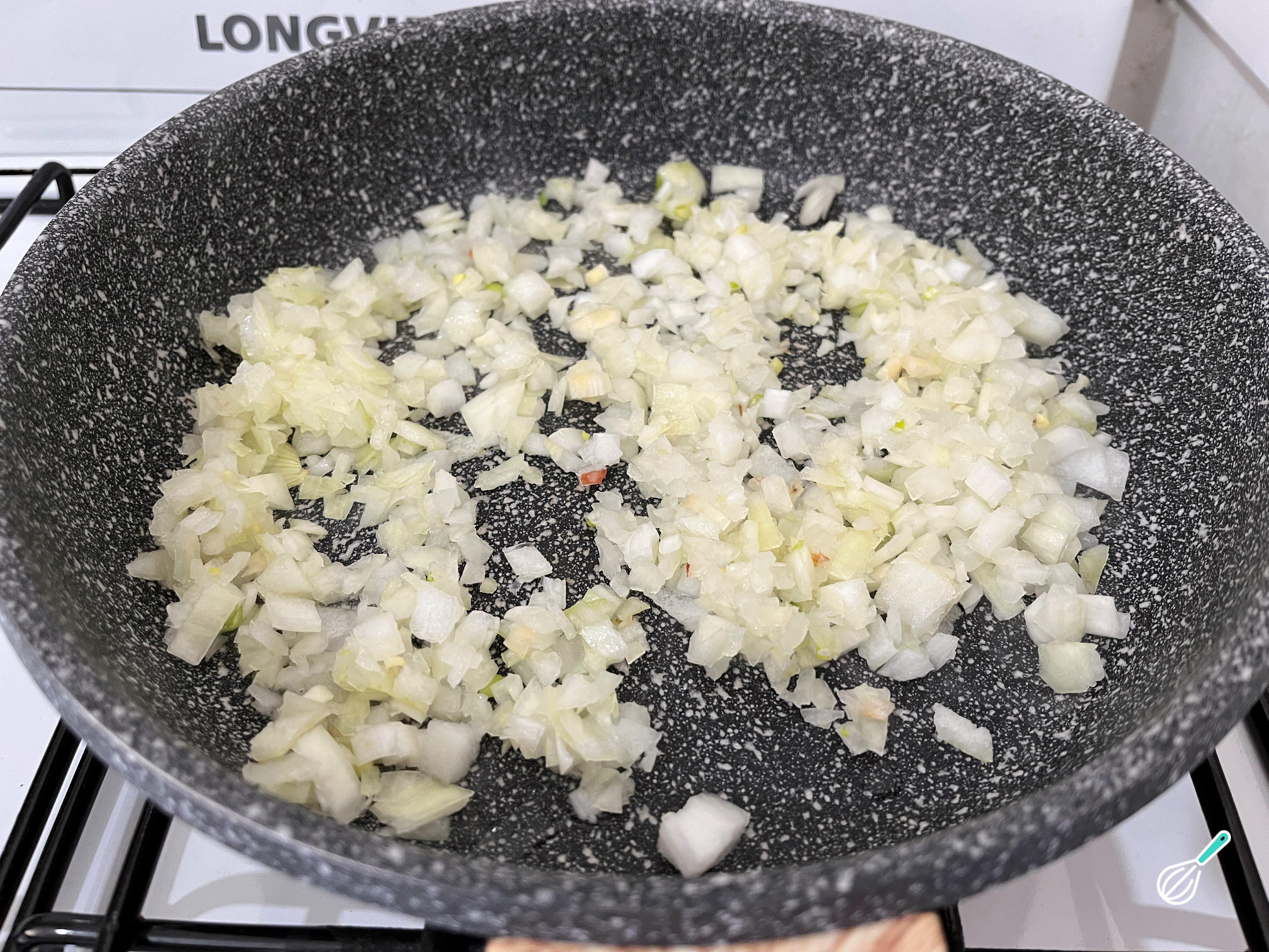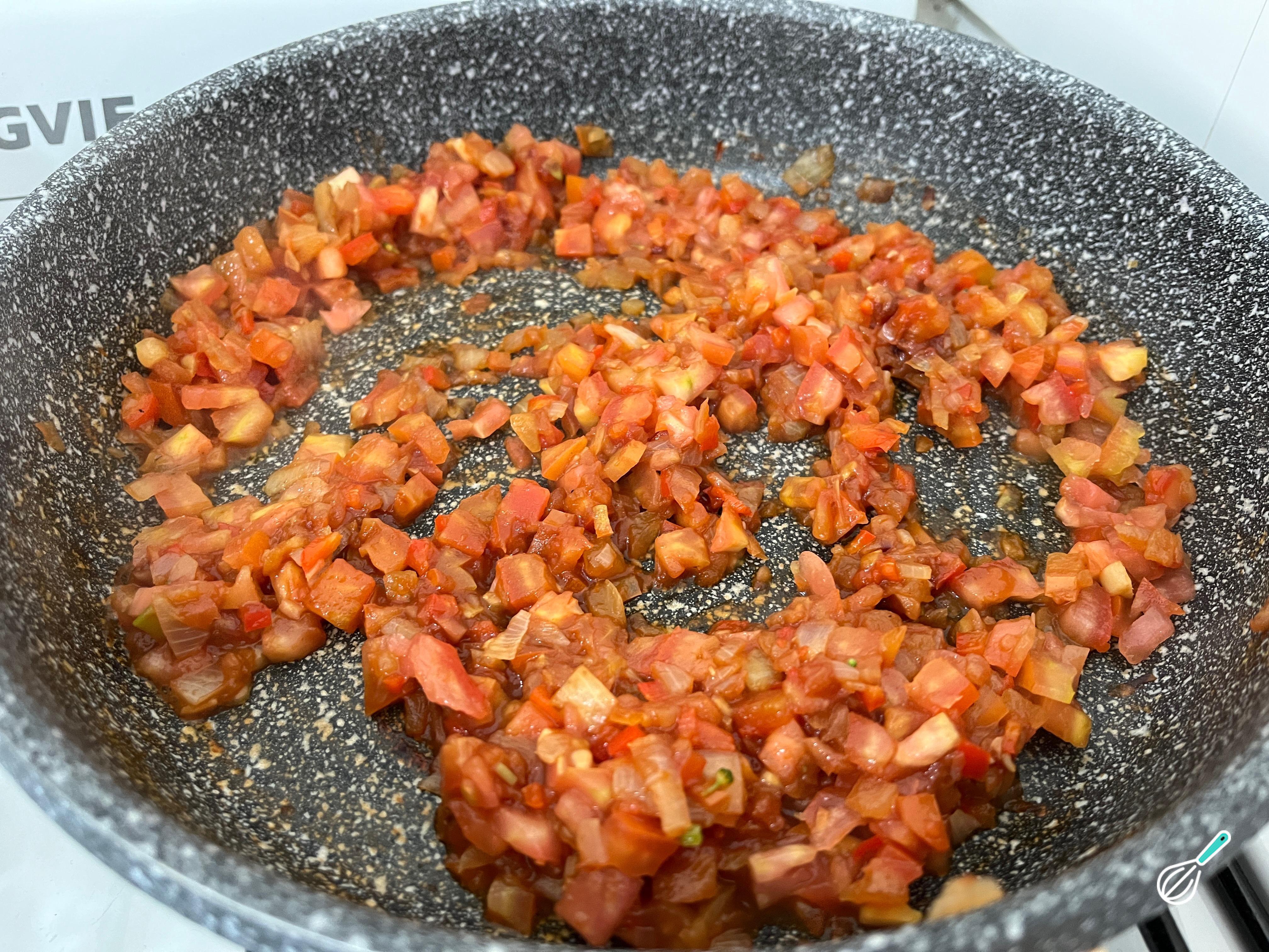 Quando os vegetais estiverem bem cozidos, acrescente a colher de sopa de extrato de tomate. Caso não tenha esse ingrediente, pode substituí-lo por um tomate ralado e cozinhá-lo por cerca de 10 minutos, até que o líquido evapore.