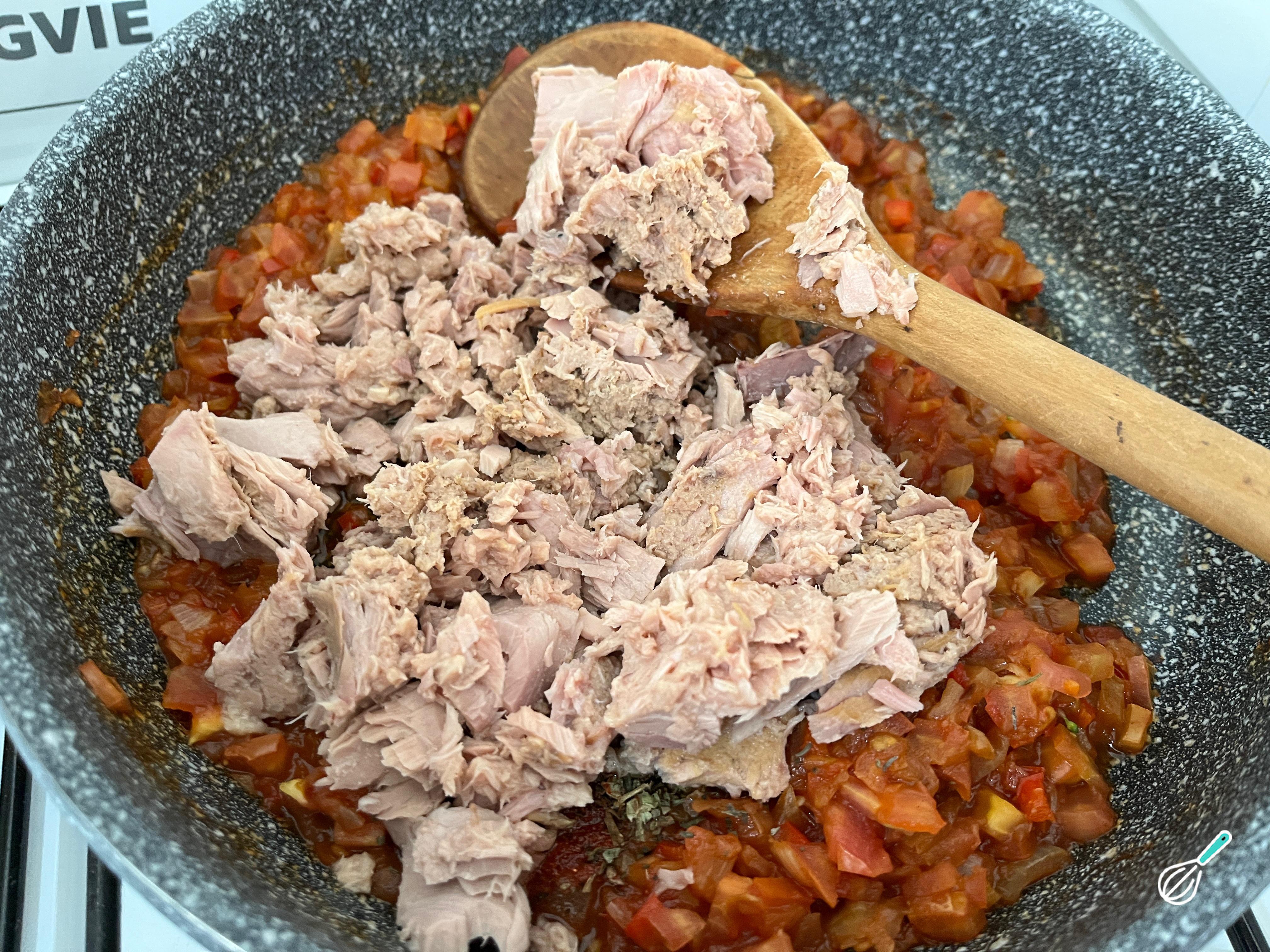 Retire o refogado do fogo para adicionar os lombos de atum previamente escorridos do líquido em que estão submersos na lata, tempere a gosto com pimenta malagueta moída, pimenta e orégano. Experimente o recheio da sua torta de atum e tomate e, se gostar, acrescente o ovo.