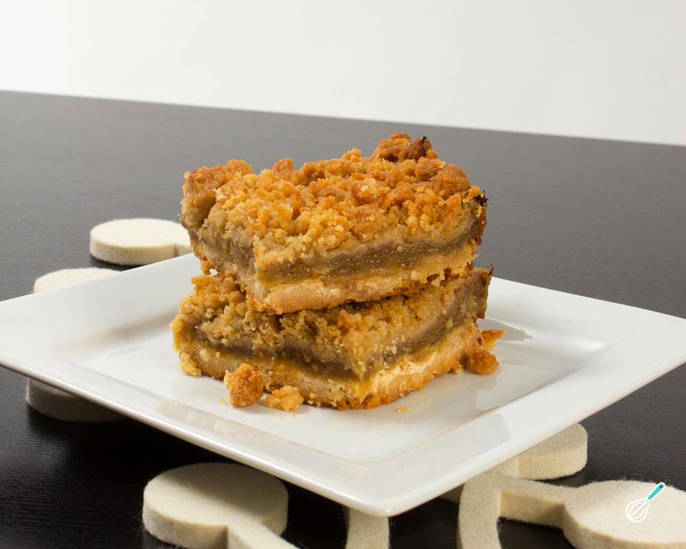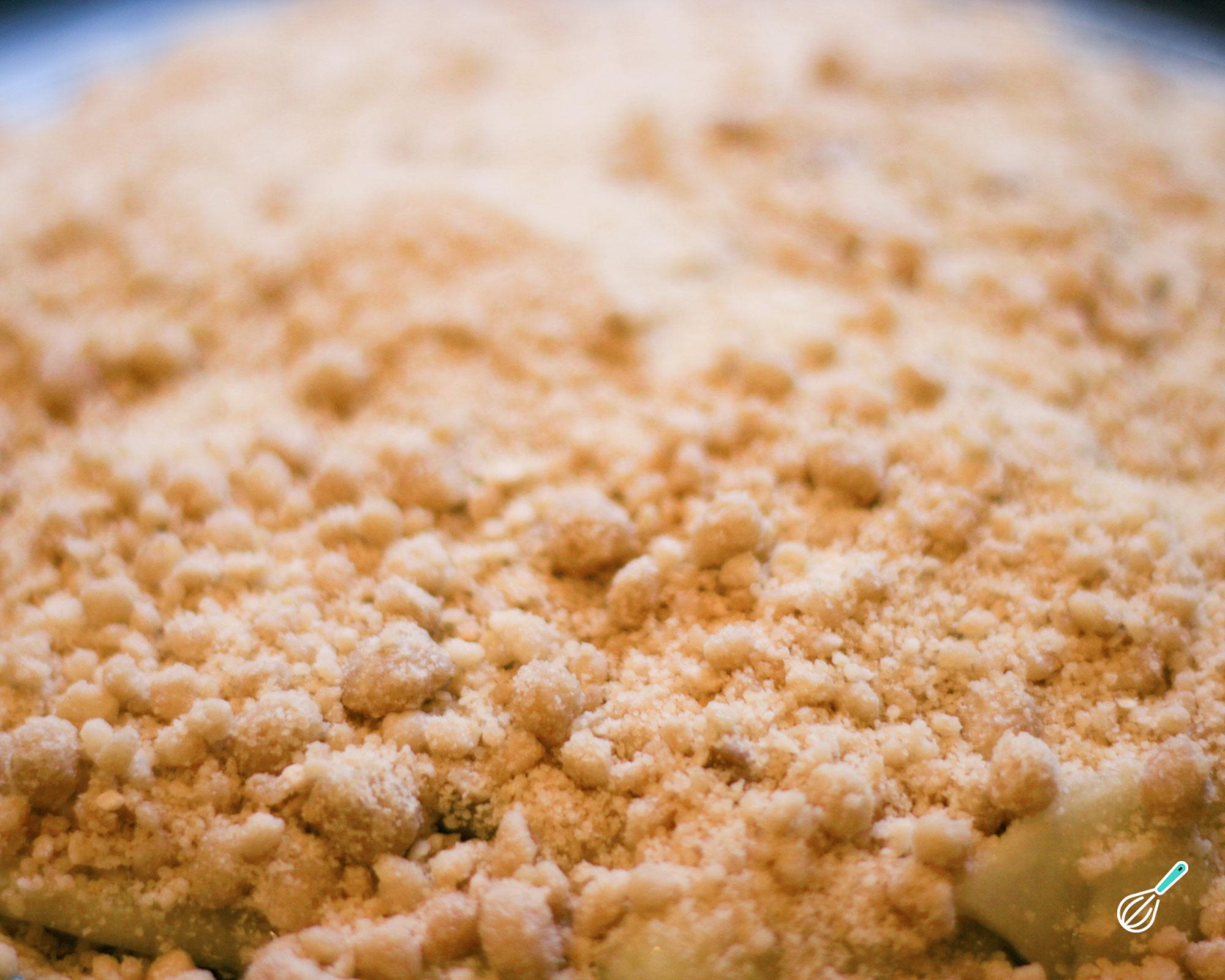 Retire a base da torta do forno e espalhe nela as bananas amassadas. Pegue a farofa reservada e desfaça-a ligeiramente com as pontas dos dedos enquanto polvilha sobre a torta. Devolva ao forno nos 180ºC, desta vez por 20 minutos ou até dourar.