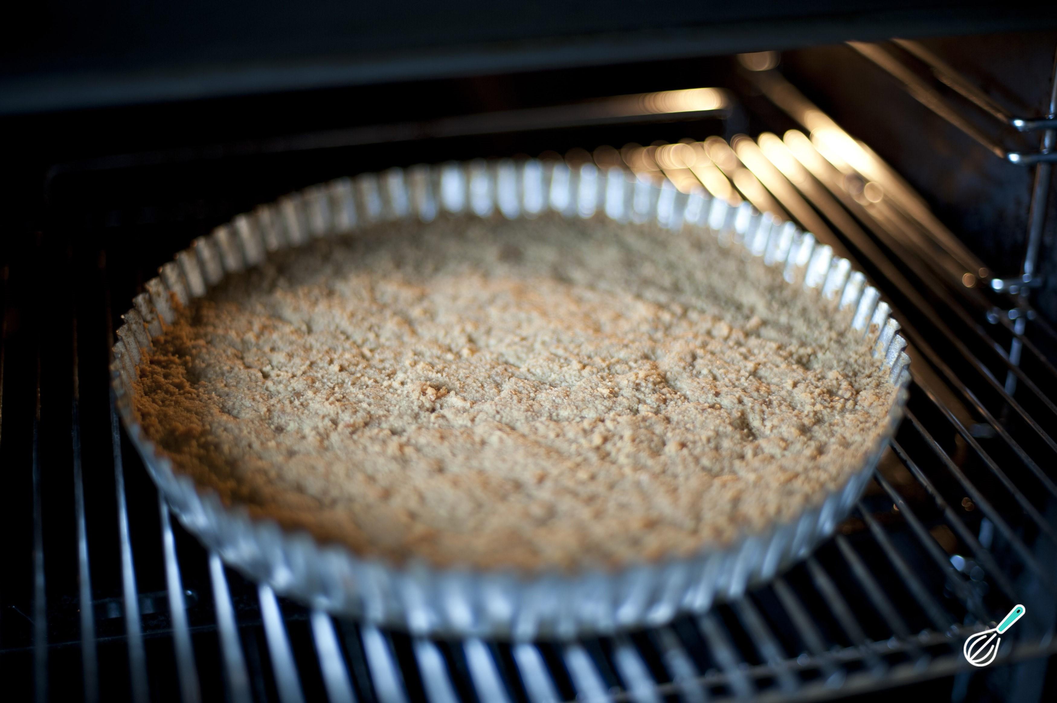 Reserve metade dessa farofa na geladeira e use o restante para forrar o fundo e laterais de uma forma de torta com fundo amovível, pressionando bem para conseguir uma massa compacta. Leve para pré-assar no forno a 180ºC por 10 minutos.