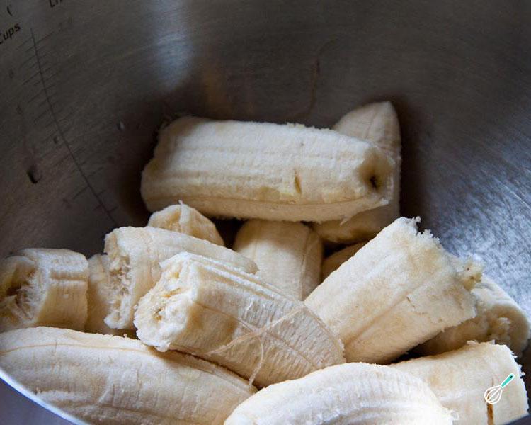 Enquanto isso, coloque as bananas descascadas numa tigela e amasse com a ajuda de um garfo. Você pode amassar as bananas completamente, até ficarem em purê, ou amassar ligeiramente para conservar alguns pedacinhos.