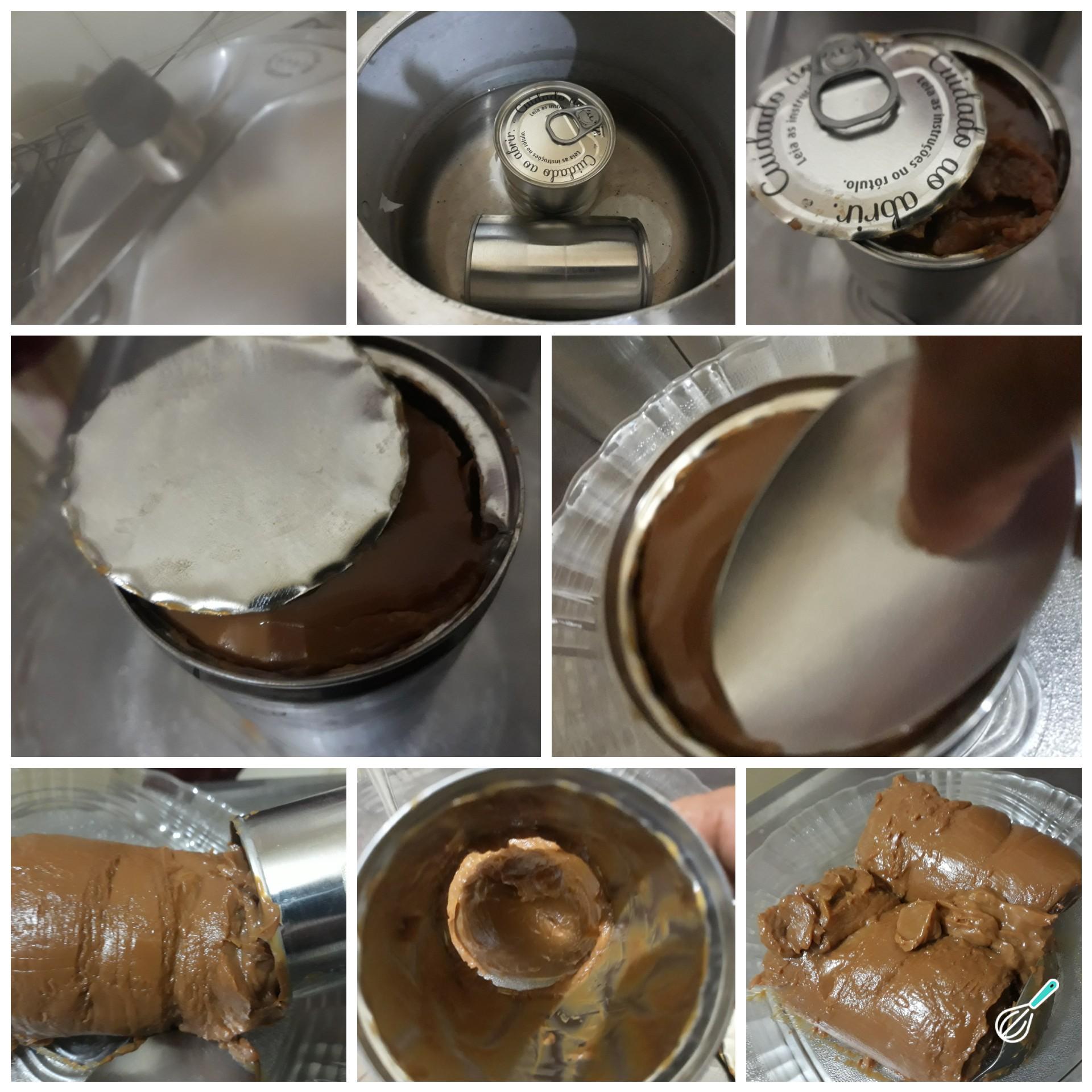 Comece por cozer o leite condensado: coloque as latas na panela de pressão com água até metade e, após pegar pressão, espere 45 minutos. Desligue o fogo deixe o vapor sair sozinho. Nesse momento retire as latas, retire o doce do interior e reserve até esfriar.
