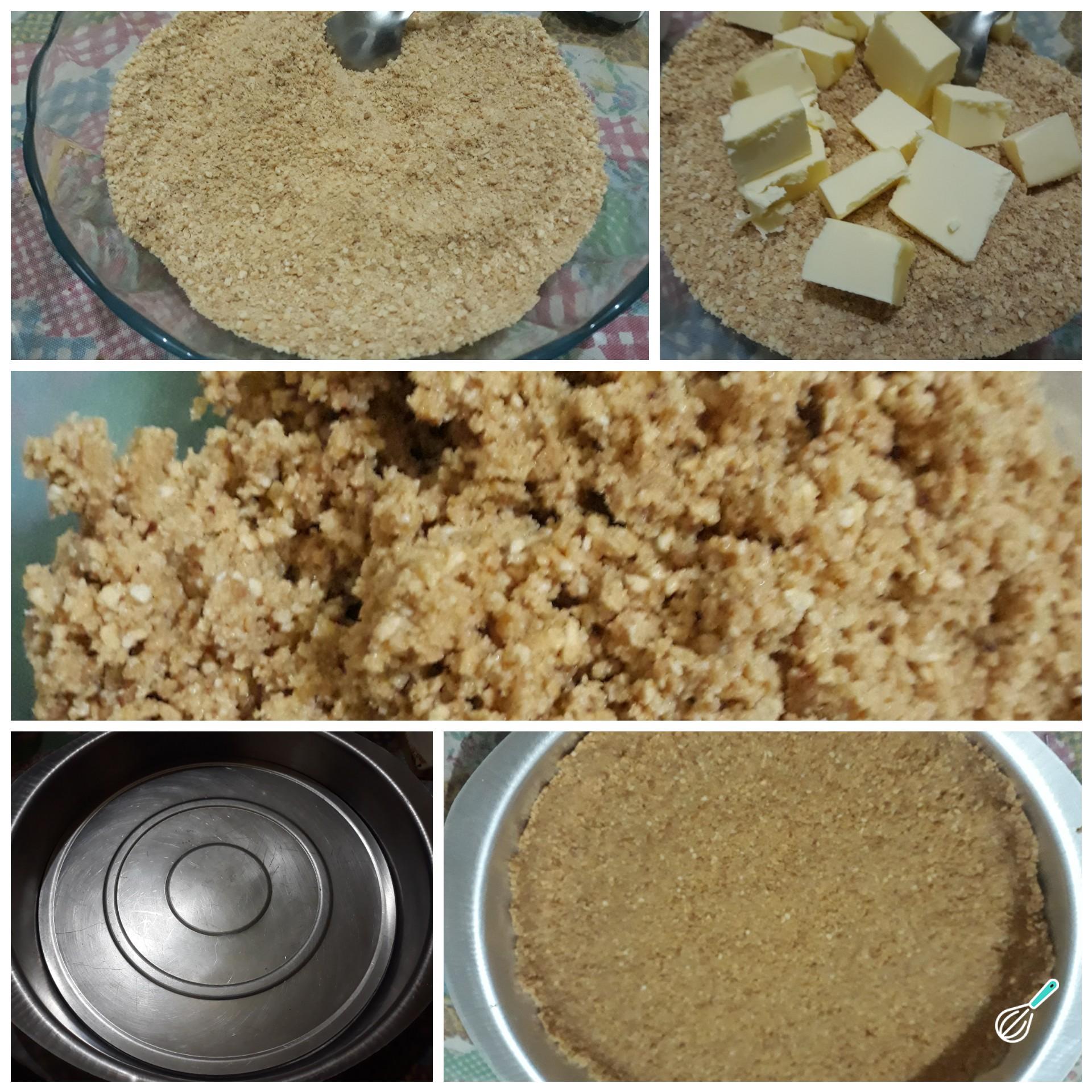 Para a base da banoffee processe as bolachas e junte a manteiga, processando de novo para obter uma farofa bem úmida. Forre uma forma de fundo removível com essa mistura, pressione bem para ficar compacta e leve à geladeira.