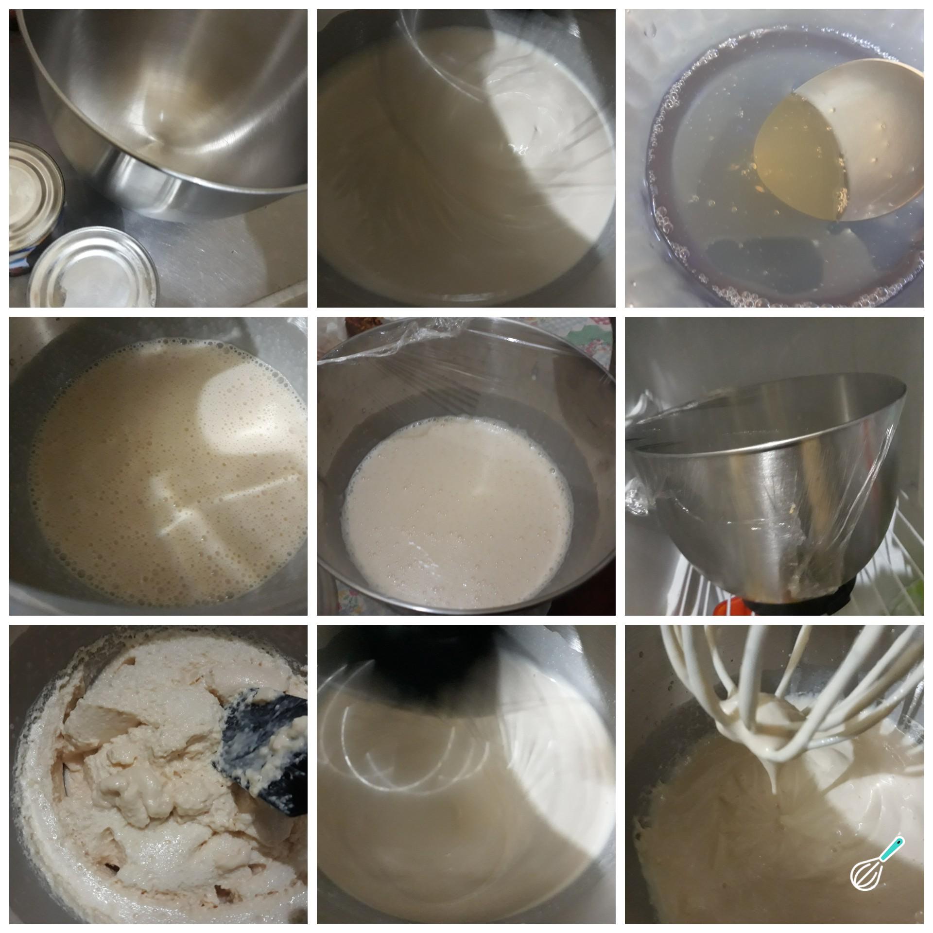 Para a cobertura desta torta de banana com leite condensado e creme de leite leve à batedeira o creme de leite e bata por 3 minutos. Com a batedeira em movimento acrescente a gelatina, hidratada na água fervente e, por último, adicione o açúcar. Desligue a batedeira e leve a mistura a geladeira até o momento da montagem.