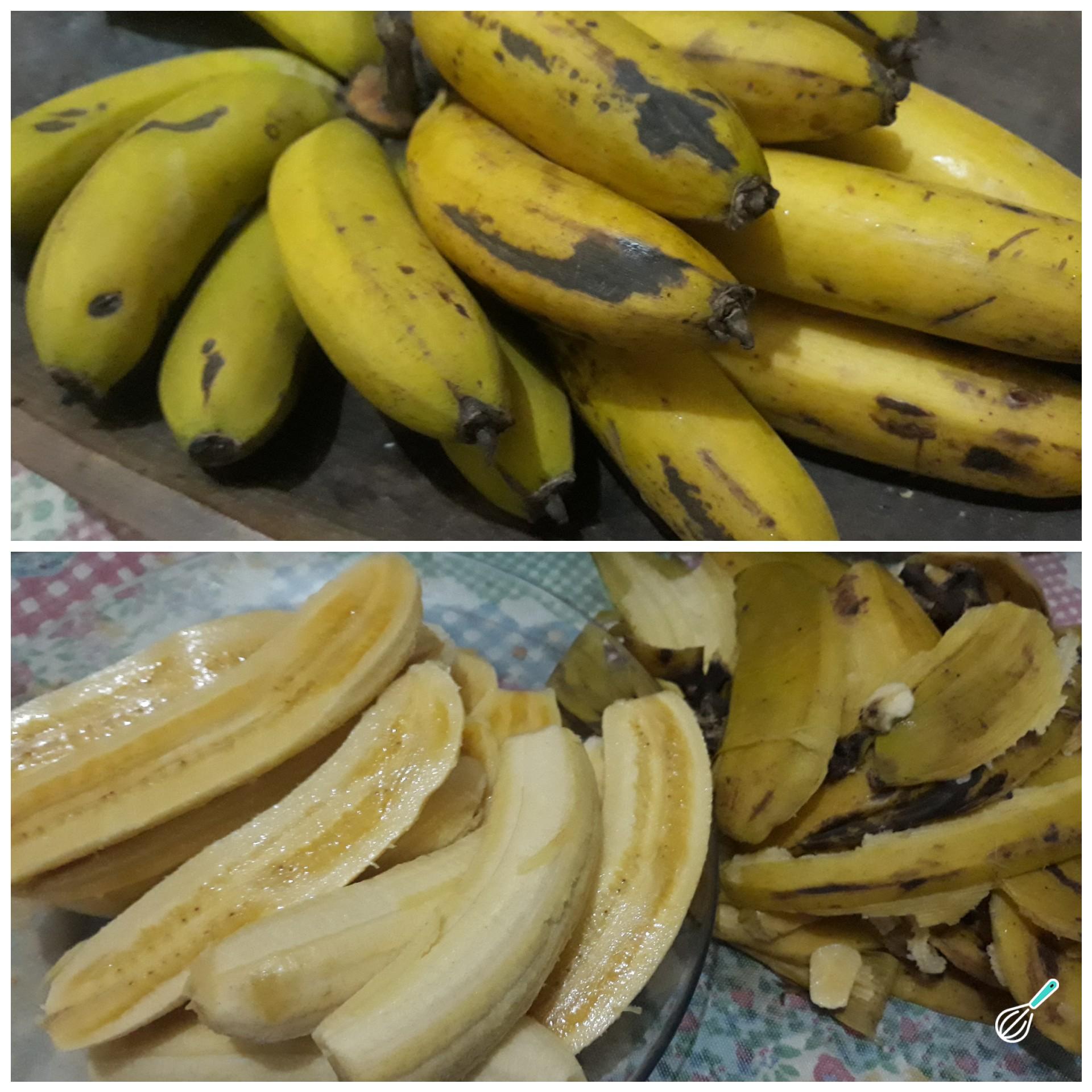 Seguidamente descasque e corte as bananas ao meio, no sentido do comprimento.
