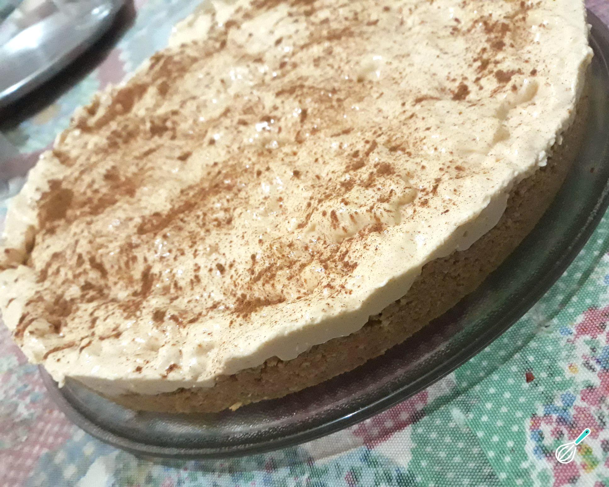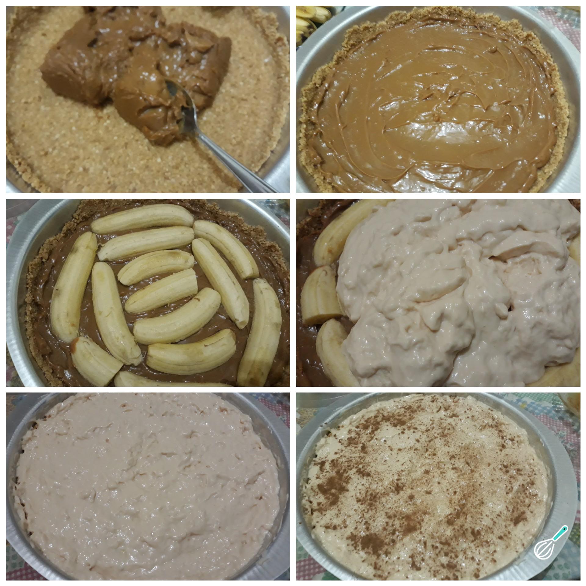 Finalmente chega a hora de montar esta torta de banana com leite condensado! Espalhe o doce da panela de pressão sobre a massa de biscoito e manteiga e distribua as bananas. Por fim espalhe o creme do passo anterior e finalize com canela em pó.