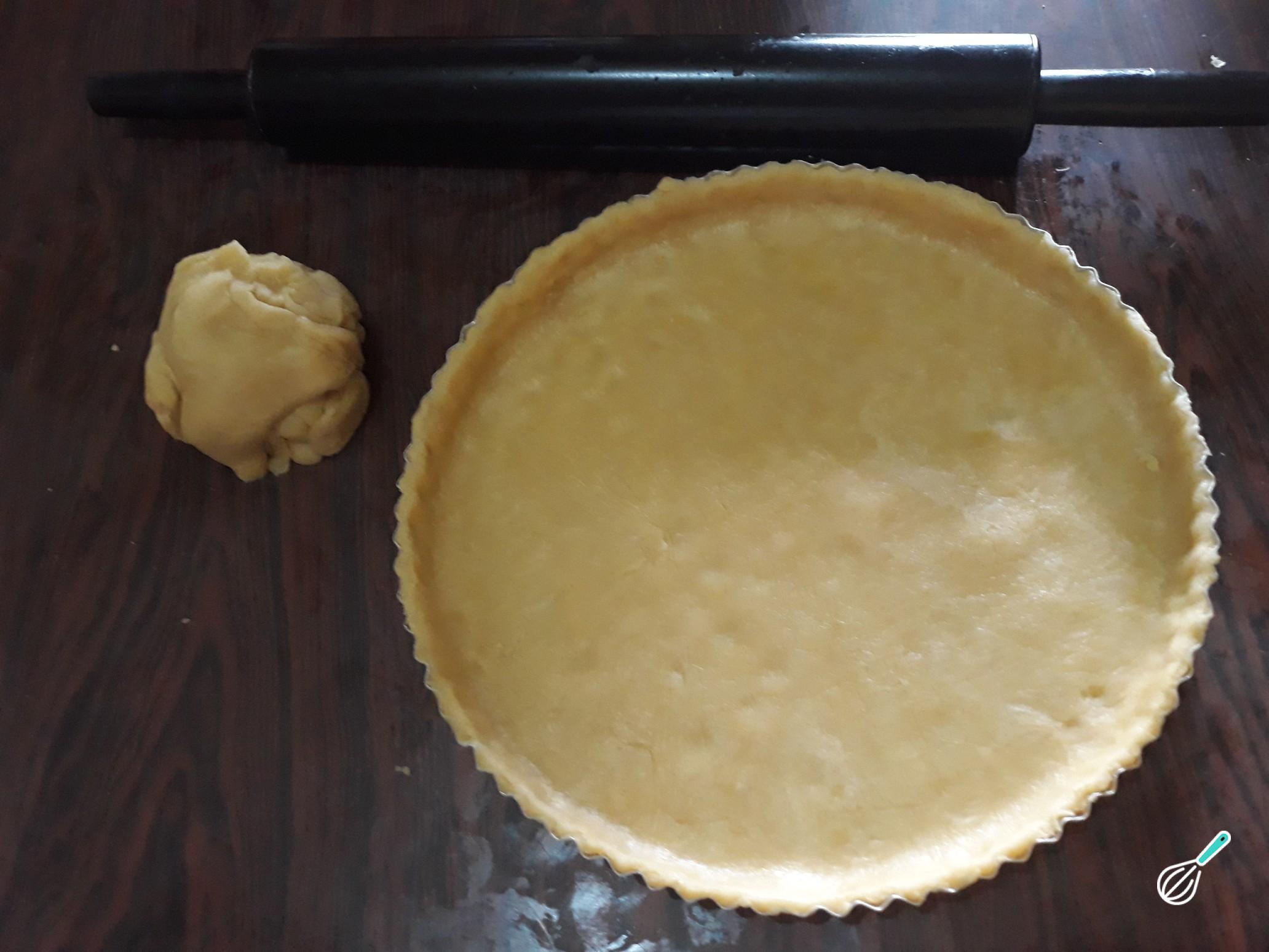 Retire a massa do refrigerador e abra em uma mesa de superfície lisa e coberta com plástico. Com cerca de 2/3 da massa forre uma forma de fundo removível e, com um garfo, fure toda a massa da forma para liberação do ar enquanto assa. Guarde a massa restante para decoração desta torta de banana caseira.