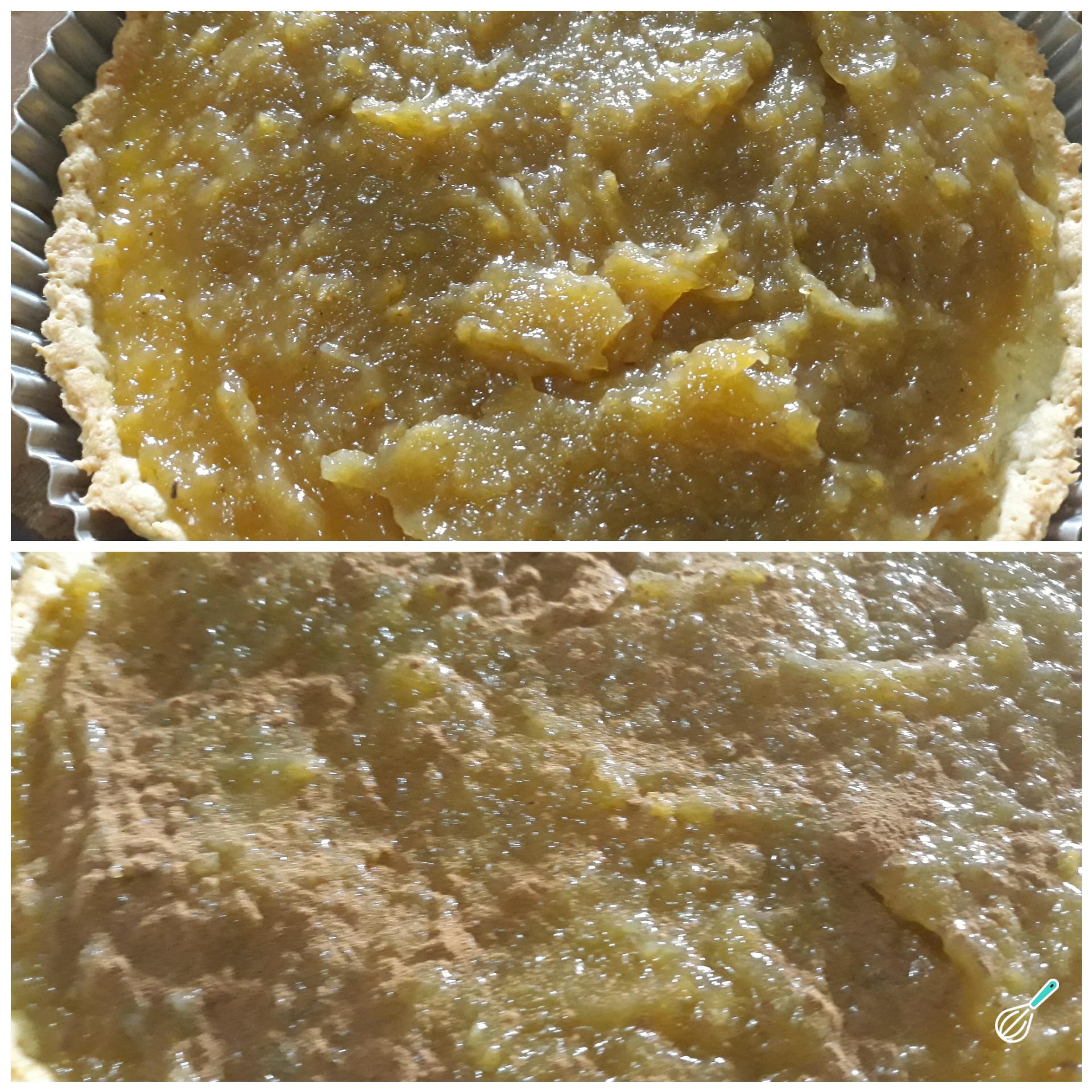 Continue preparando esta receita de torta de banana com massa podre: retire a massa do forno (não desligue o forno), coloque o doce de banana já morno e polvilhe a canela.