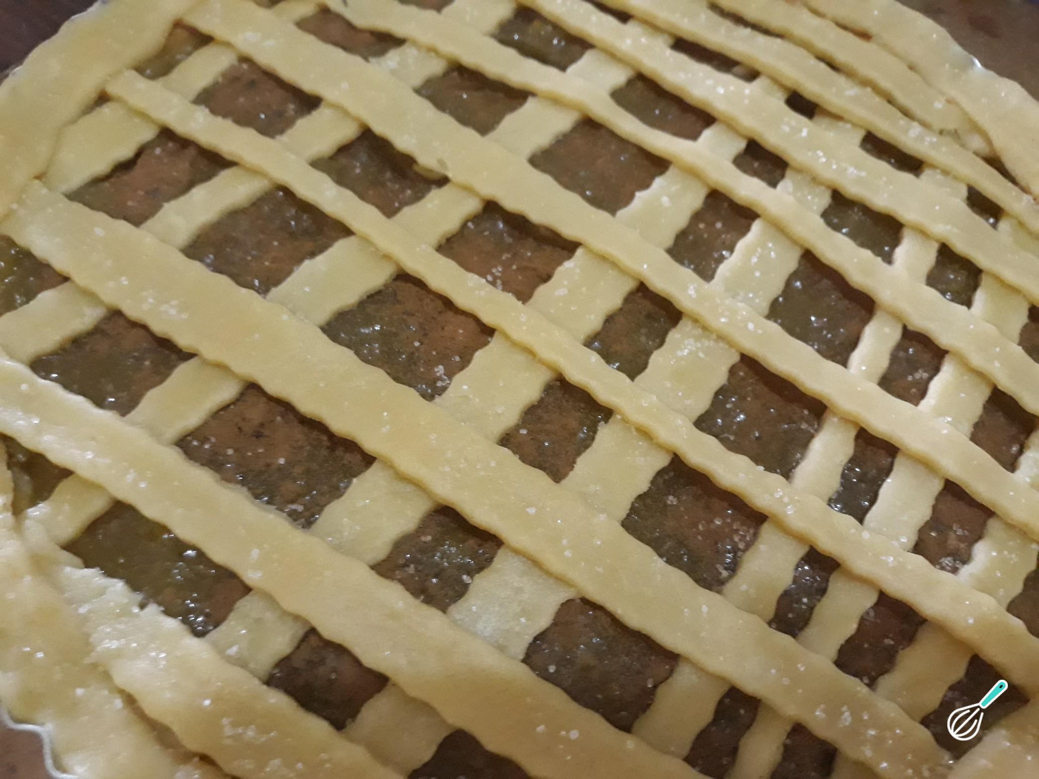 Faça tiras com a massa reservada e cubra a torta com elas, como na fotografia. Polvilhe o açúcar cristal e volte com a torta ao forno por 20 minutos ou até dourar na superfície e nas laterais.