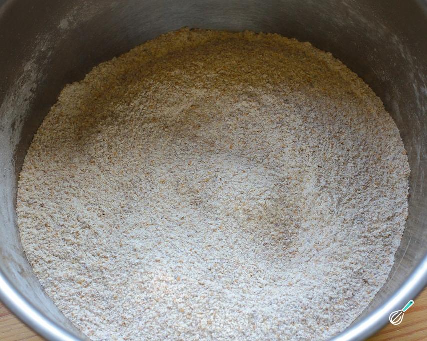 Misture os ingredientes secos peneirados numa vasilha: o açúcar, as farinhas e o fermento. No liquidificador bata os restantes ingredientes: as bananas, os ovos e a margarina.