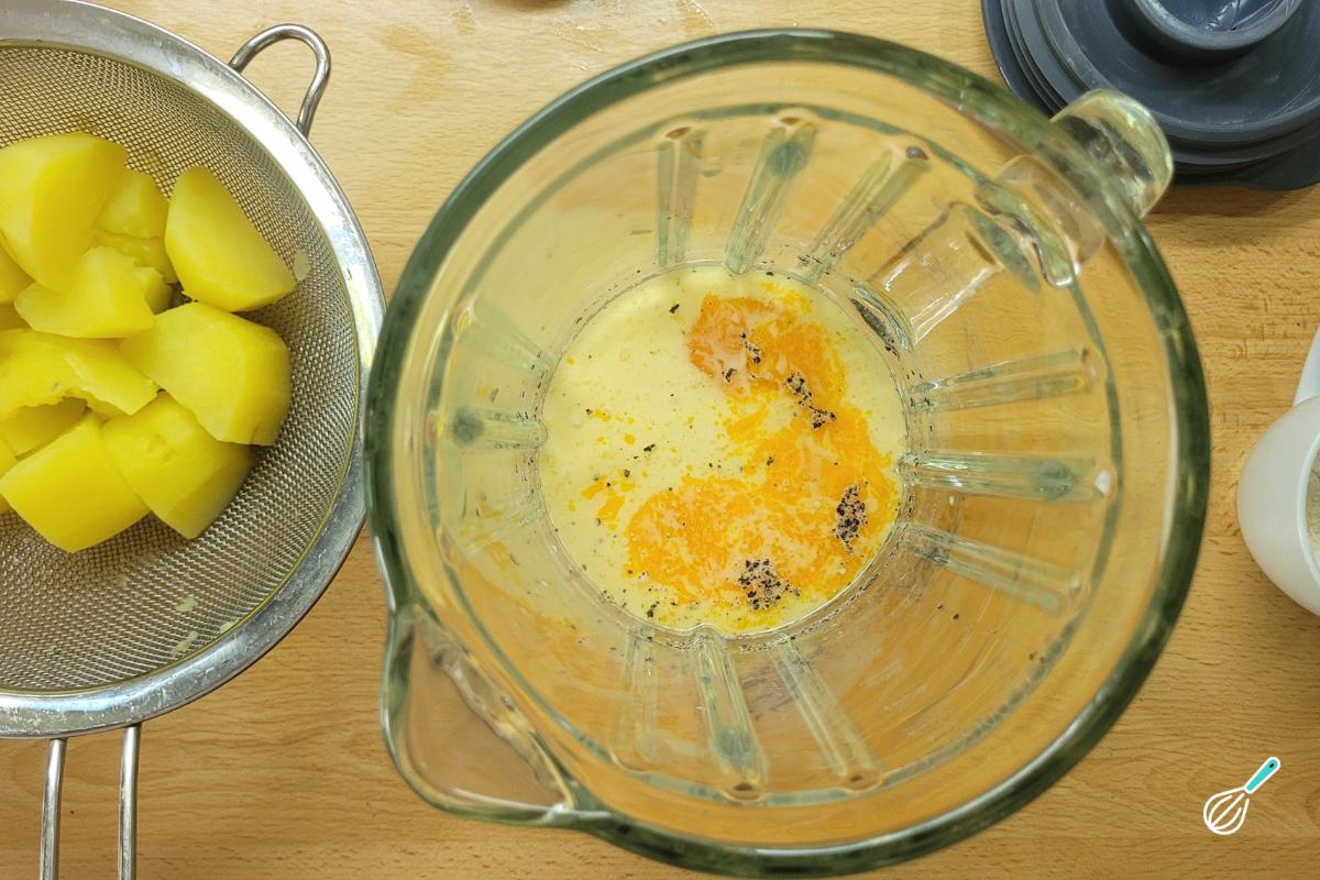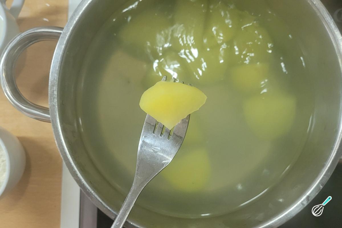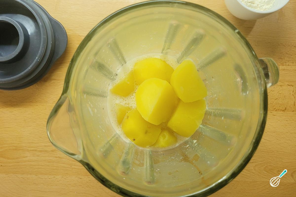 Nesse ponto, as batatas já devem estar bem macias. Escorra e deixe esfriar um pouco. Nem precisa amassar as batatas, porque a massa vai ser batida no liquidificador.
