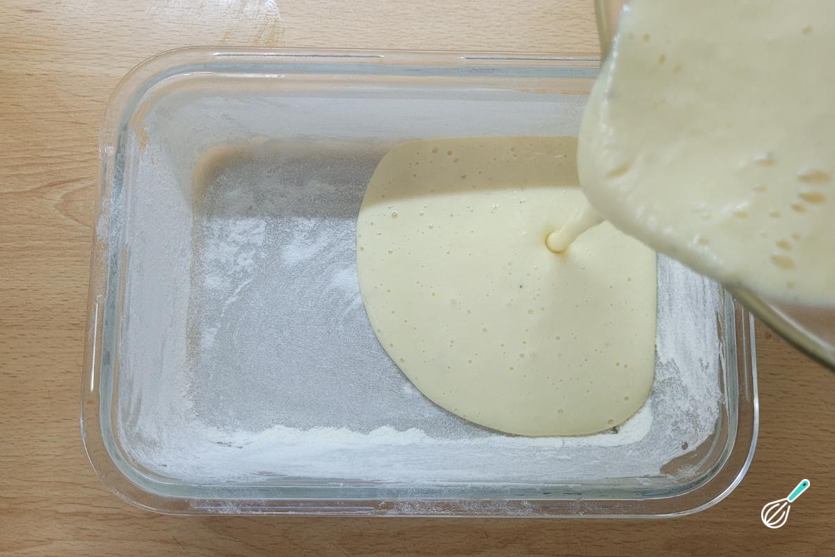 Despeje metade da massa em um refratário untado (untei com azeite e farinha de trigo).