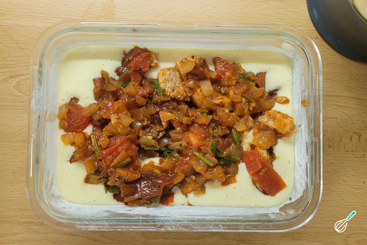 Coloque o recheio por cima com cuidado, despeje o restante da massa e leve ao forno pré-aquecido a 180oC até que a massa fique bem douradinha.