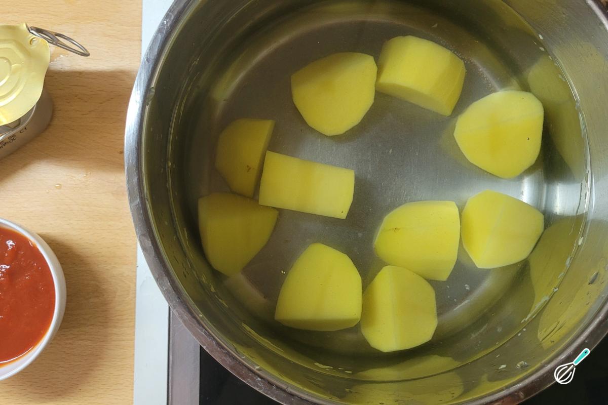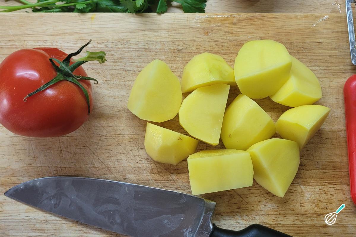 Comece descascando e cortando as batatas em pedaços menores - assim elas cozinham mais rápido.