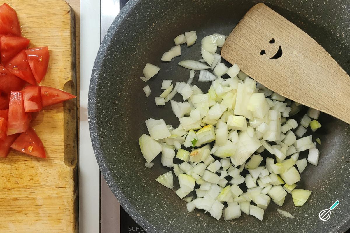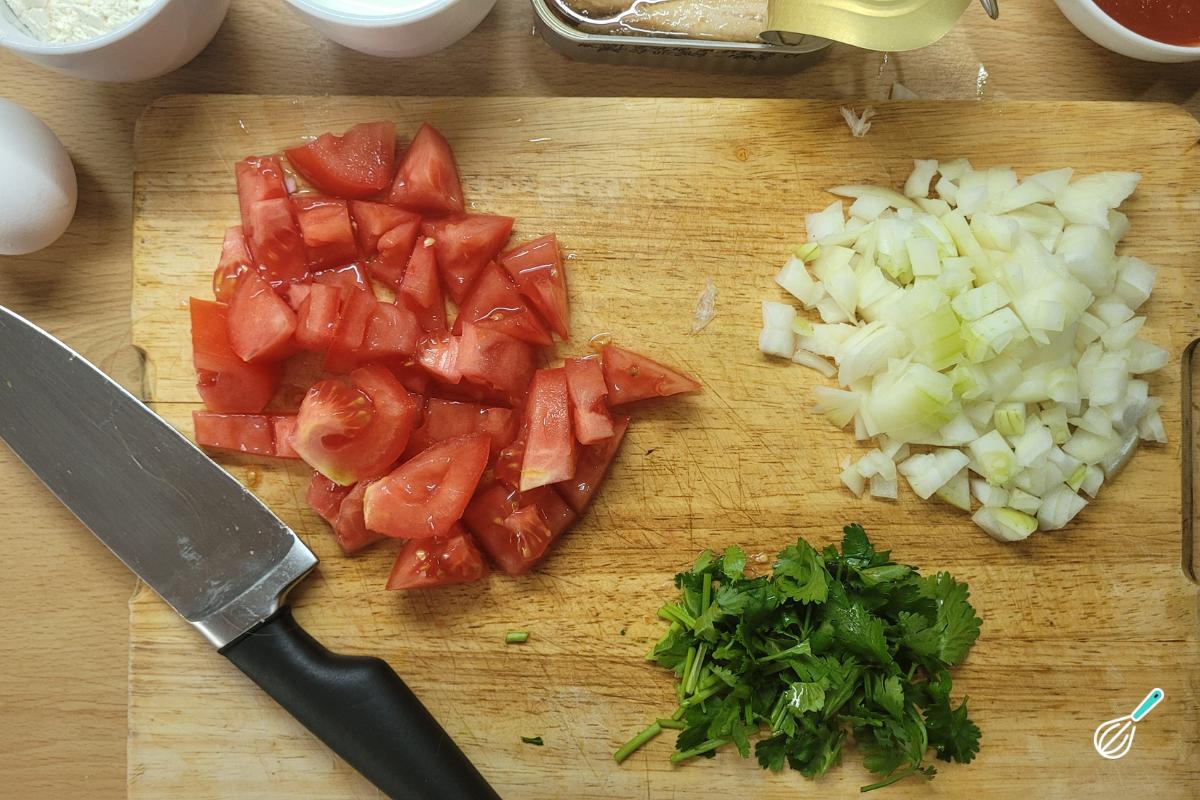 Enquanto as batatas cozinham, a gente prepara o recheio. Comece cortando a cebola e o tomate em cubos e pique o coentro.