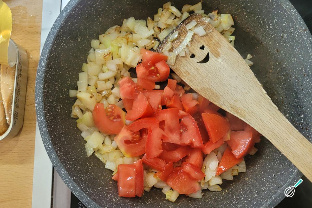 Quando a cebola estiver bem dourada, adicione os tomates e deixe que soltem bem a água até formar quase uma pastinha. Aqui não adicionei sal, pois a sardinha em lata já costuma ser salgada.