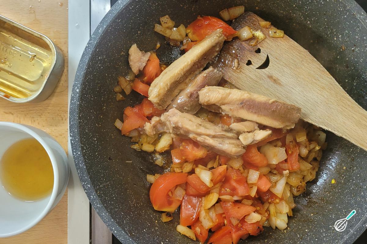 Escorra a sardinha e reserve o azeite da lata, que será usado depois na massa. Adicione as sardinhas escorridas na frigideira.
