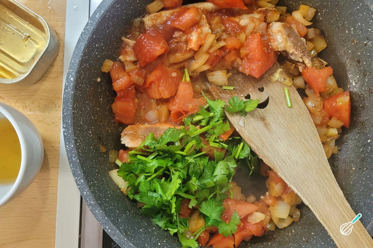 Adicione a passata de tomate e o coentro, misture tudo e reserve para esfriar um pouco antes de juntar à massa.