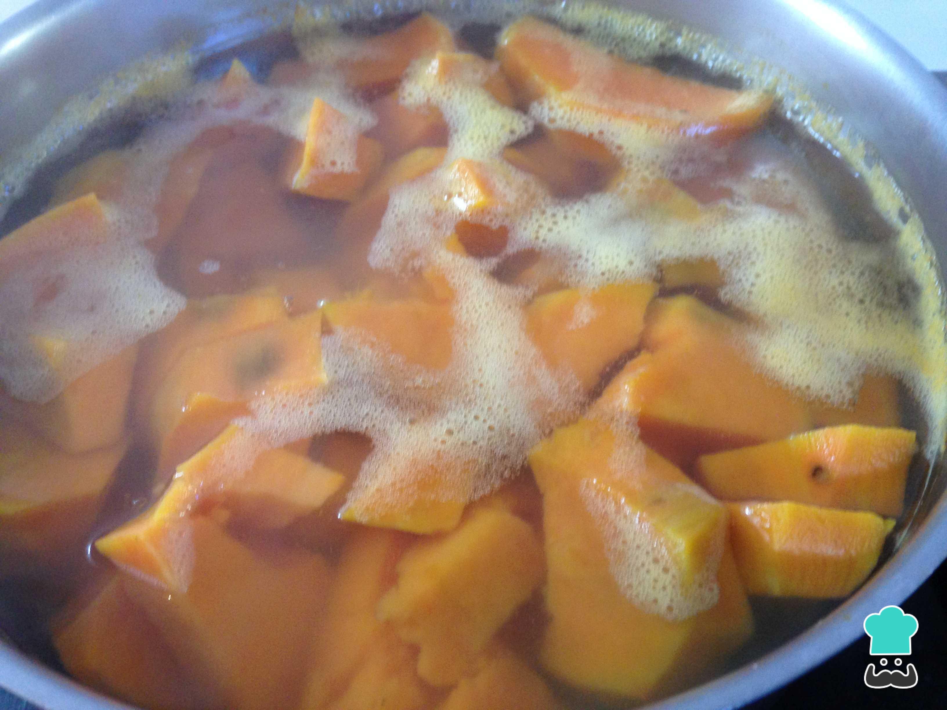 Em seguida descasque a batata-doce e corte em cubos pequenos. Cozinhe em uma panela com água por 10-12 minutos, ou até ficar macia.