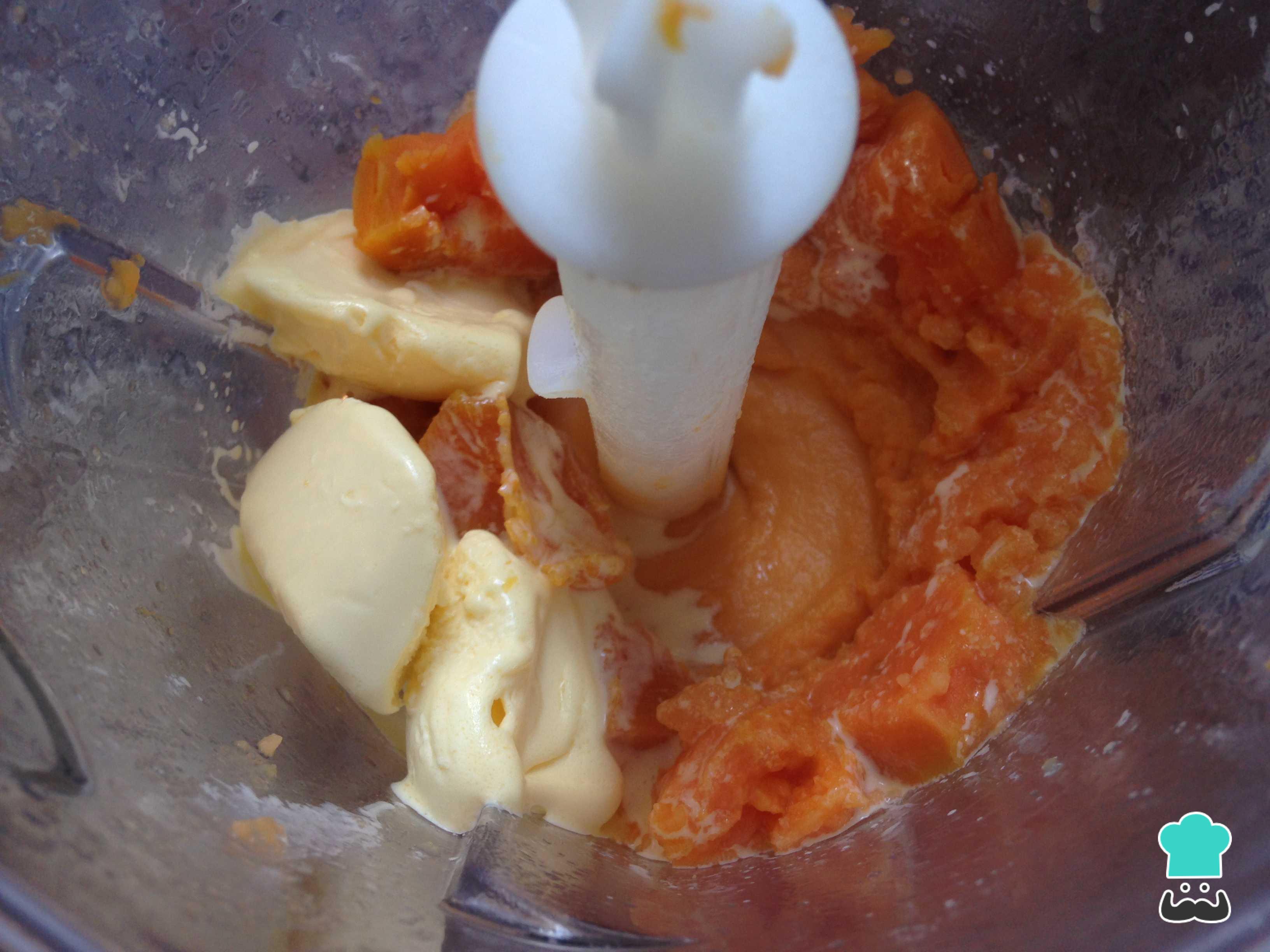 Após o passo anterior, escorra a batata doce e bata no liquidificador, processador ou com o mixer com os restantes ingredientes. O resultado deverá ser uma pasta homogênea, ou seja, sem grumos.