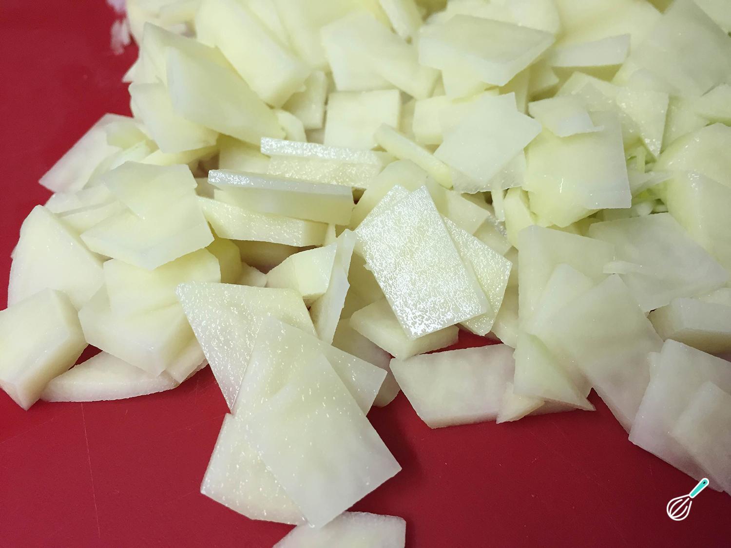 Comece por descascar as batatas, cortar em pedaços e fatiar em fatias finas, assim conseguimos que a torta de batata simples e fácil cozinhe mais rápido.