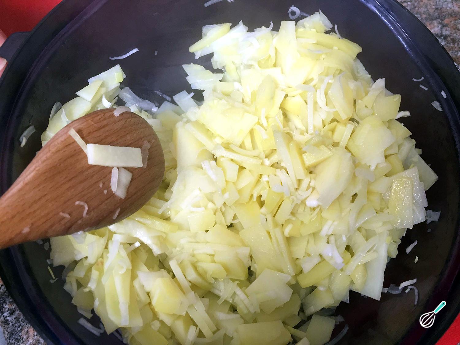 Assim que as batatas estejam macias, misture com os ovos batidos e acerte o sal. Coloque numa frigideira untada em fogo médio e deixe cozinhar até ficar consistente. Depois vire ao contrário e termine de cozinhar até dourar.