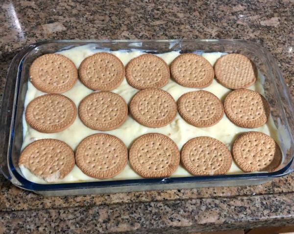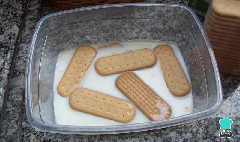 Quando o creme estiver morno, coloque as bolachas maisena da sua torta de bolacha em um recipiente fundo (reservando 5 ou 6 delas para depois). Acrescente as restantes 2 xícaras de leite e deixe de molho por uns minutos, para amolecerem.