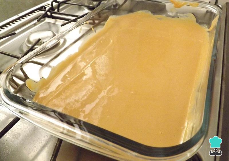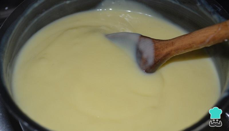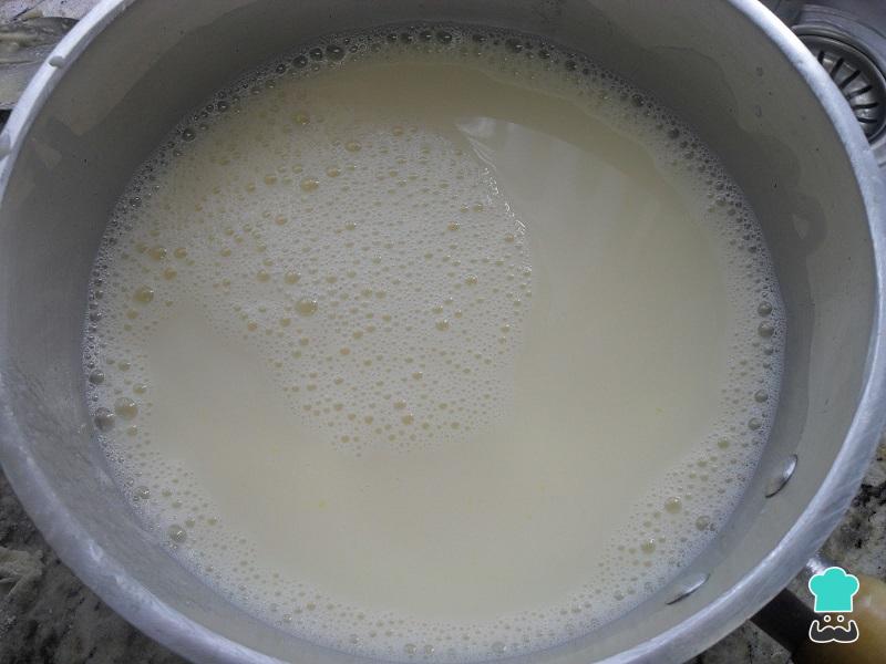 O primeiro passo da receita da torta de bolacha é colocar 4 xícaras de leite em uma panela e dissolver nele o amido de milho peneirado, enquanto mexe com um batedor de claras.
