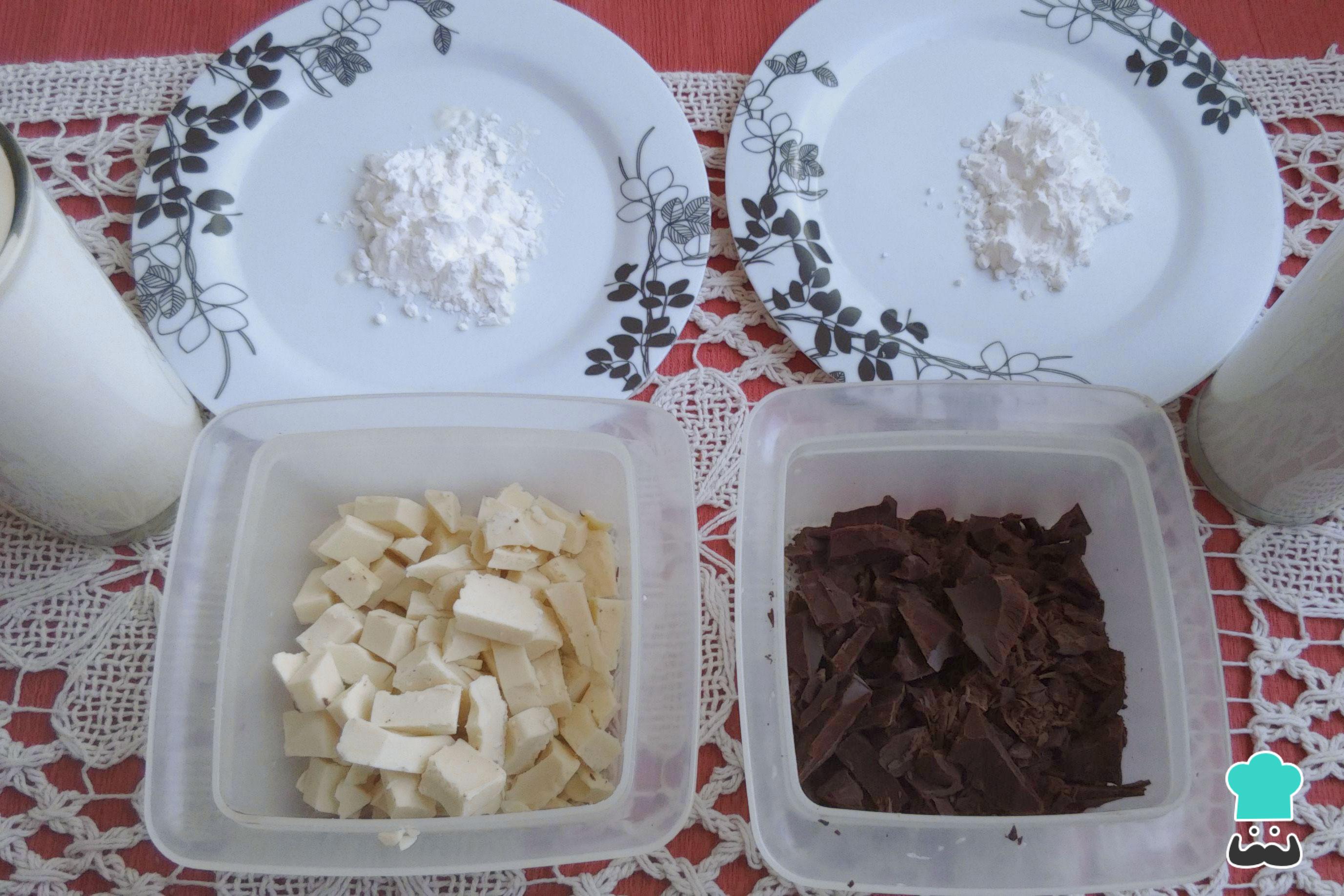 Nesta receita vamos preparar 2 cremes: um creme branco e um creme de chocolate. Ambos são preparados da mesma maneira e com a mesma quantidade de ingredientes. Portanto, o modo de preparo abaixo deve ser realizado exatamente do mesmo jeito para o chocolate amargo e para o chocolate branco. Comece por dissolver 1 colher de sopa de maizena numa das partes de 250 ml de leite.