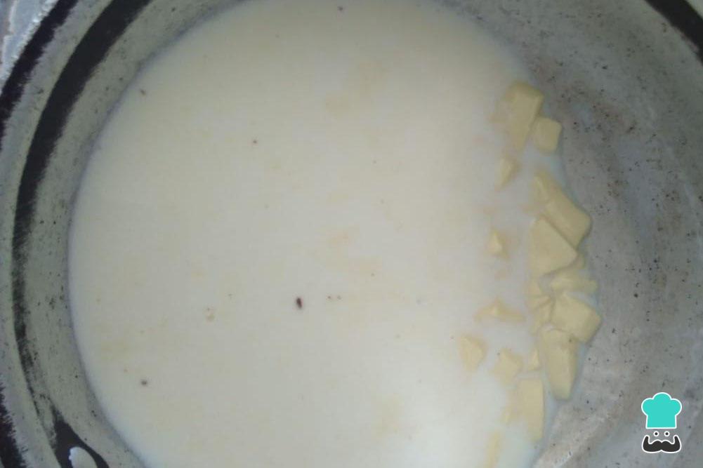 Depois leve ao fogo o leite com a maizena dissolvida do passo anterior, o chocolate branco e os 50 gramas de leite condensado. Mexa até o chocolate derreter completamente e a mistura ficar cremosa.