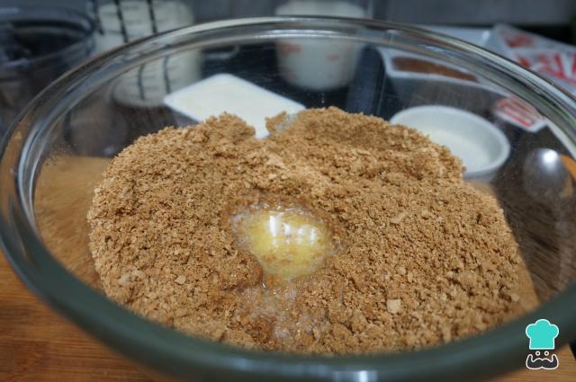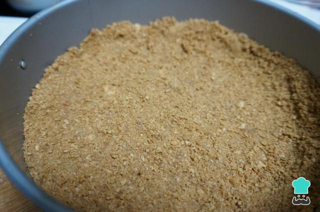 Prepare a base da torta: triture os biscoitos num processador ou robot de cozinha até virar farinha e coloque numa tigela. Depois derreta a manteiga no microondas, adicione aos biscoitos e misture até obter uma farofa úmida.