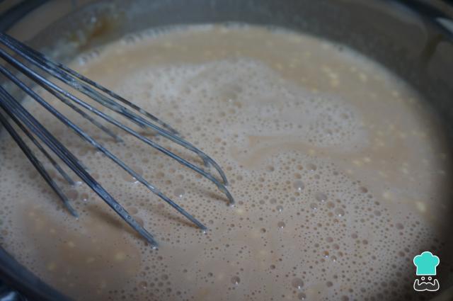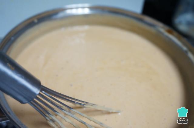 Leve ao fogo uma panela com o creme de leite ou nata e metade do leite. Quando começar a esquentar adicione o queijo cremoso e o doce de leite. Fique mexendo até misturar tudo muito bem, usando de preferência um fouet, como na imagem.