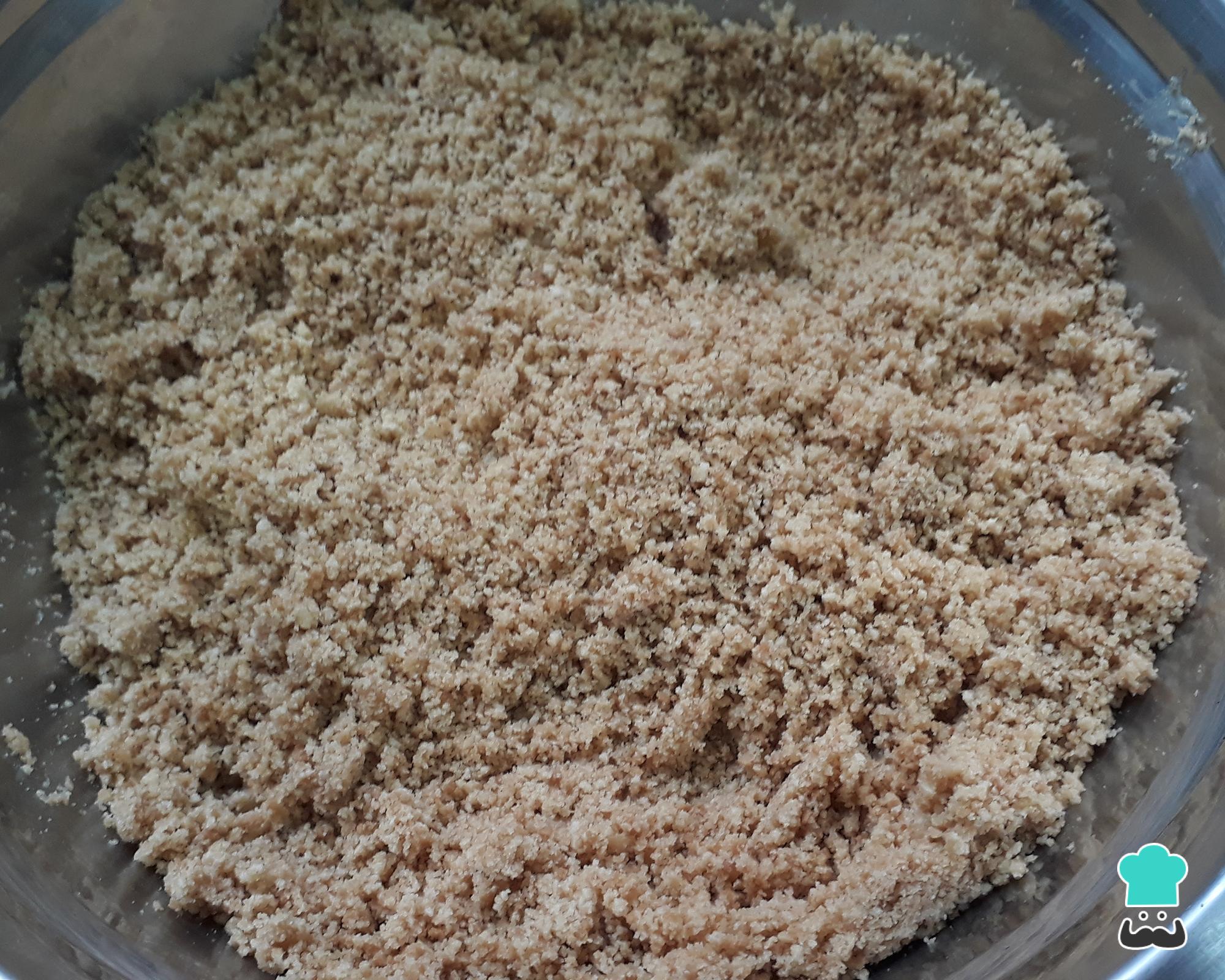 Comece pela base de torta de bolacha: triture em um processador ou no liquidificador um pacote e meio de bolacha tipo maisena. Depois de triturada a bolacha, acrescente a manteira em temperatura ambiente e amasse bem até formar uma farofinha bem molhadinha, como na foto.