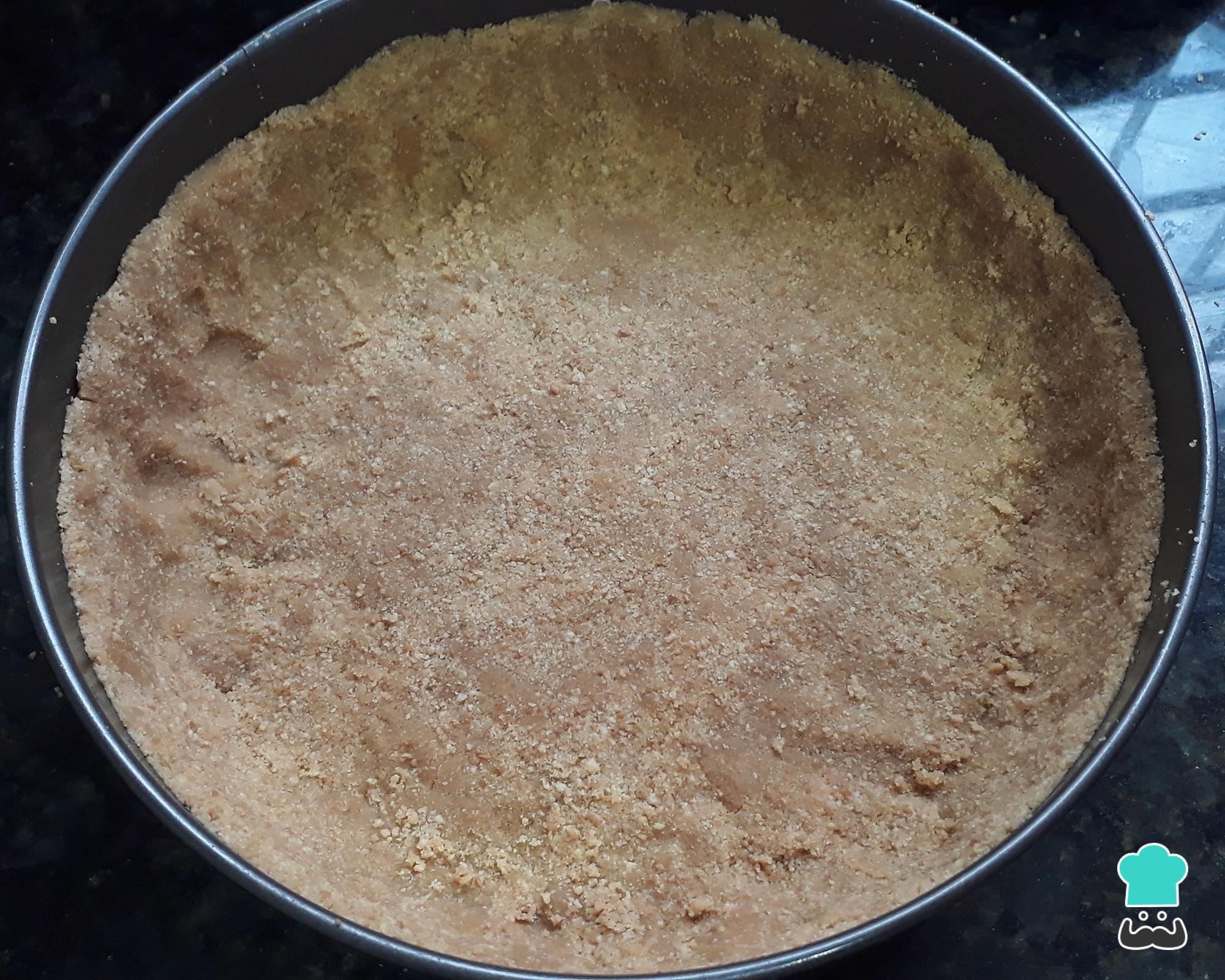 Ajeite a farofa de bolacha no fundo e laterais em uma fôrma com fundo falso, como mostra a imagem. Depois asse no forno pré-aquecido 180 ºC por 10 minutos.