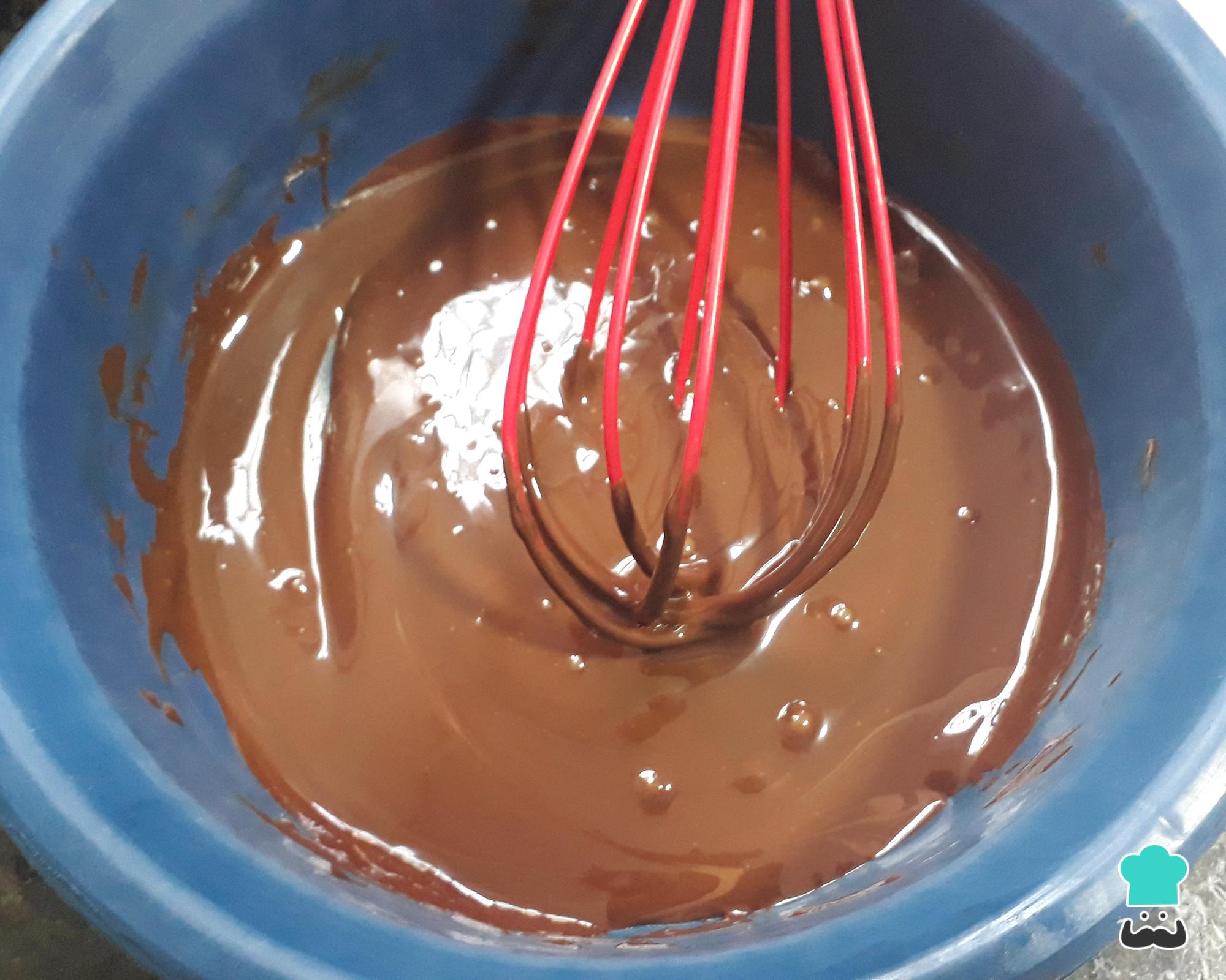 Para a cobertura derreta o chocolate meio amargo de 30 em 30 segundos no microondas. Quando o chocolate estiver bem derretido, acrescente o creme de leite e misture com o auxílio de um fouet. Outra opção é derreter o chocolate em banho-maria.