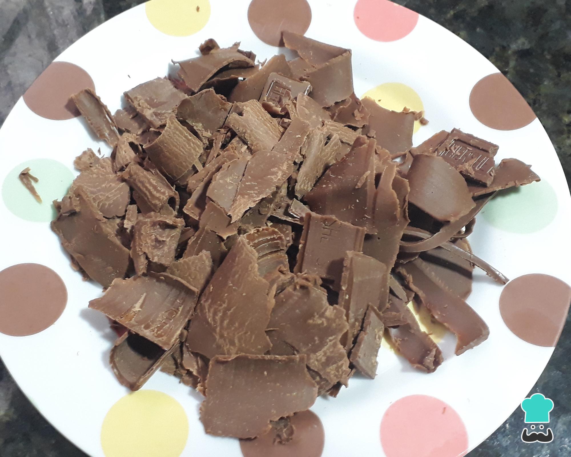 Use um descascador de legumes e para fazer as raspas de chocolate ao leite, elas serão usadas na decoração desta sobremesa com leite ninho. Para conseguir as raspas é importante que o chocolate esteja em temperatura ambiente.