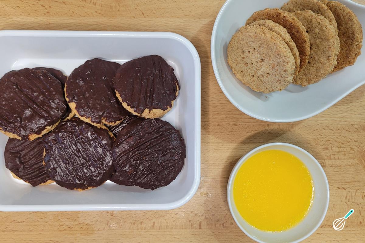 Separe os ingredientes para fazer a base da sua torta de bolacha rápida e fácil de liquidificador. Aqui usei biscoitos caseiros feitos com farinha integral. Reservei alguns para triturar e formar a base e outros cobri com chocolate para a lateral da torta.