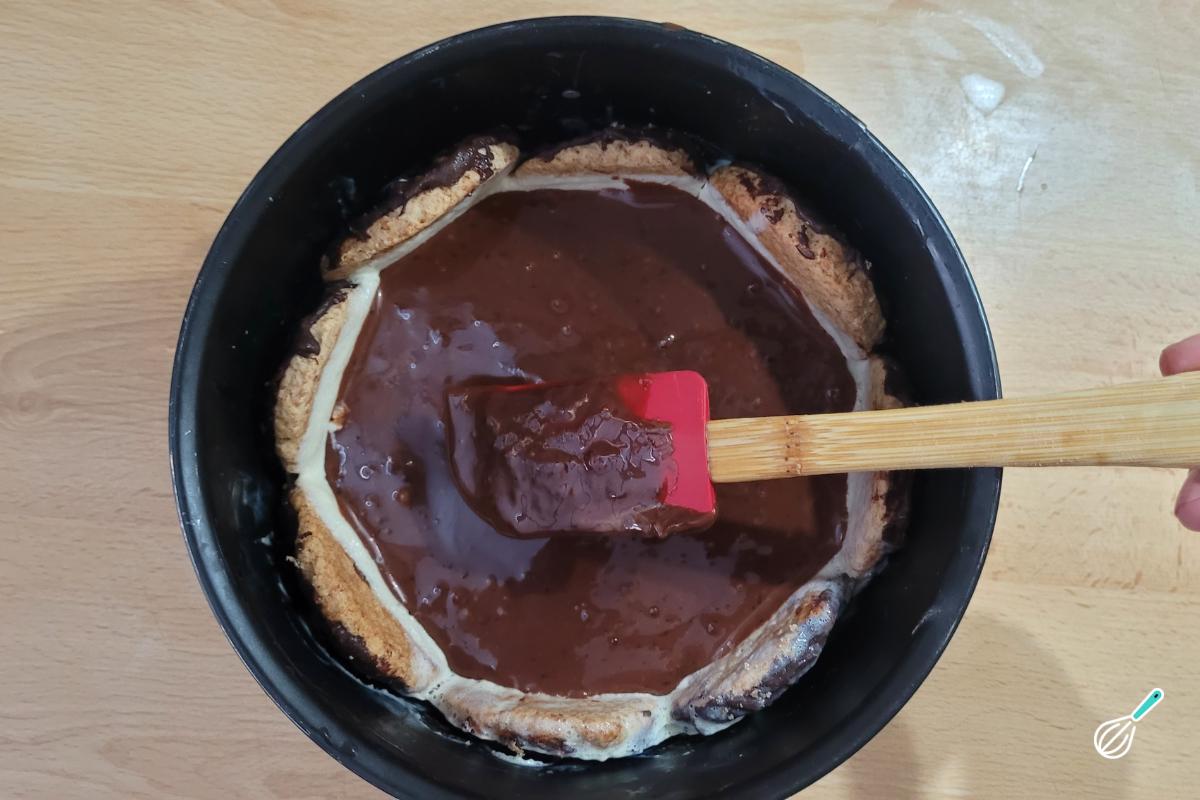 Quando a torta estiver firme, espalhe o ganache por cima e leve novamente à geladeira para o ganache firmar.