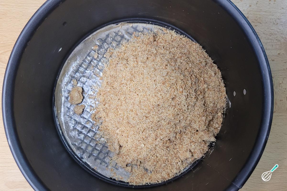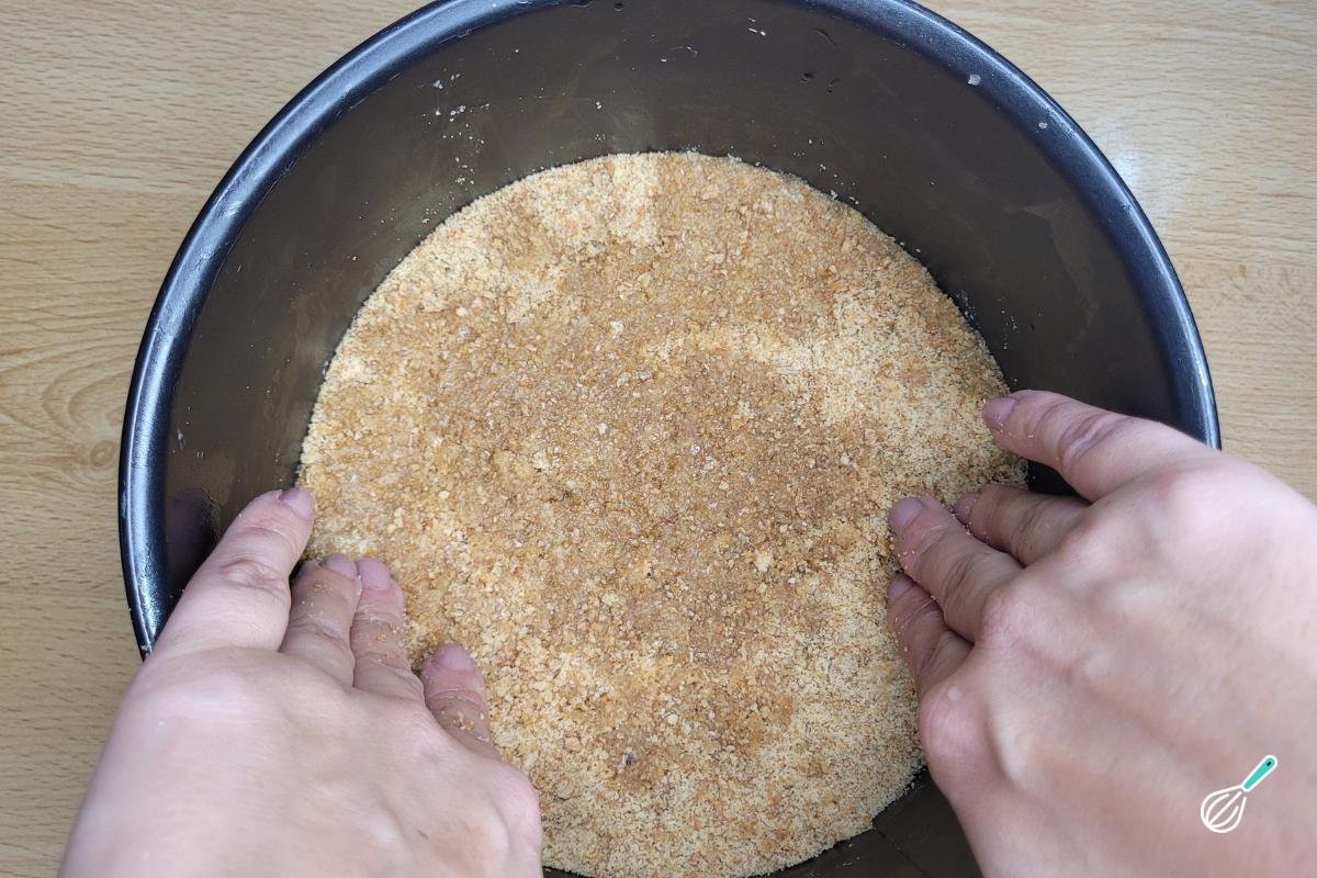 Adicione a manteiga e com as mãos, vá pressionando na base da forma até que a manteiga tenha dado liga nos biscoitos e tenha uma base para a torta. Algumas pessoas gostam de assar a base da torta, mas os biscoitos já estão prontos, então não é necessário e eu particularmente não faço isso.