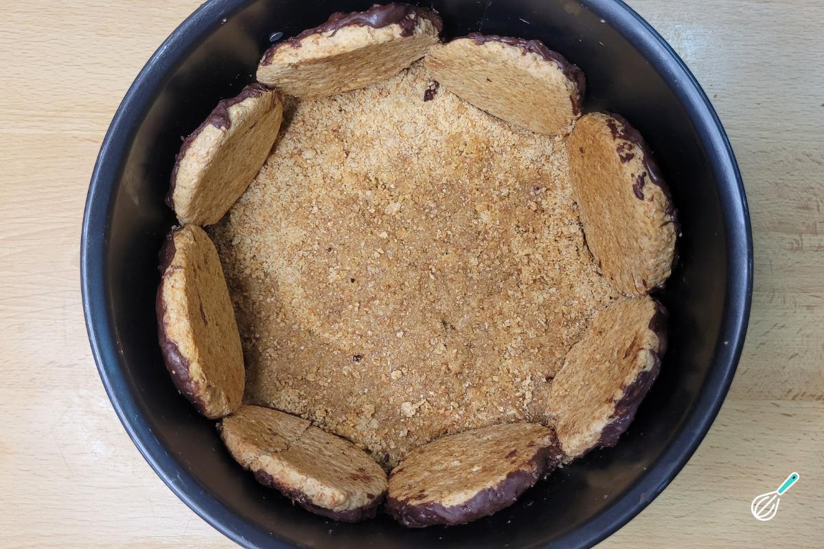 Espalhe os biscoitos no fundo da forma da torta. Para essa torta, dê preferência a uma forma de fundo removível para ficar mais fácil de desenformar. Gosto de colocar papel manteiga no fundo para ficar mais fácil de retirar depois.