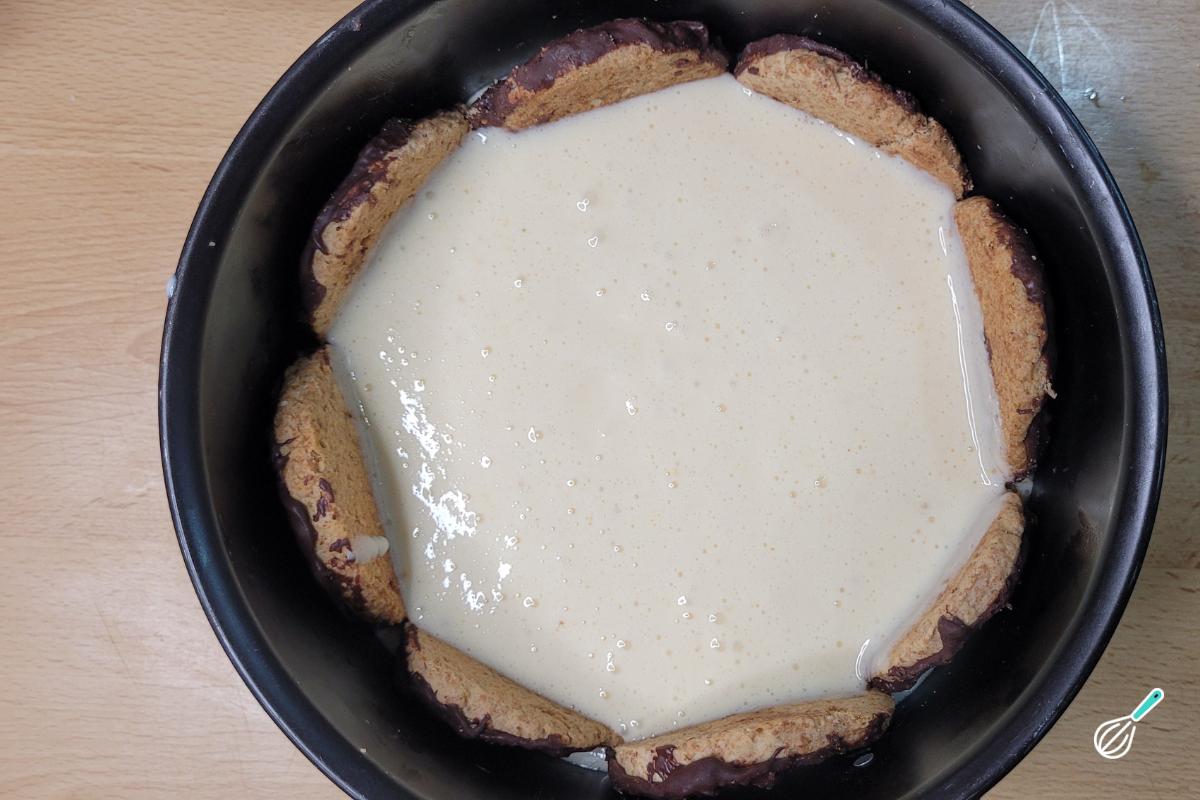 Vá colocando os biscoitos com chocolate na lateral da forma um ao lado do outro com a parte do chocolate virada para fora. Leve para a geladeira enquanto faz o recheio.