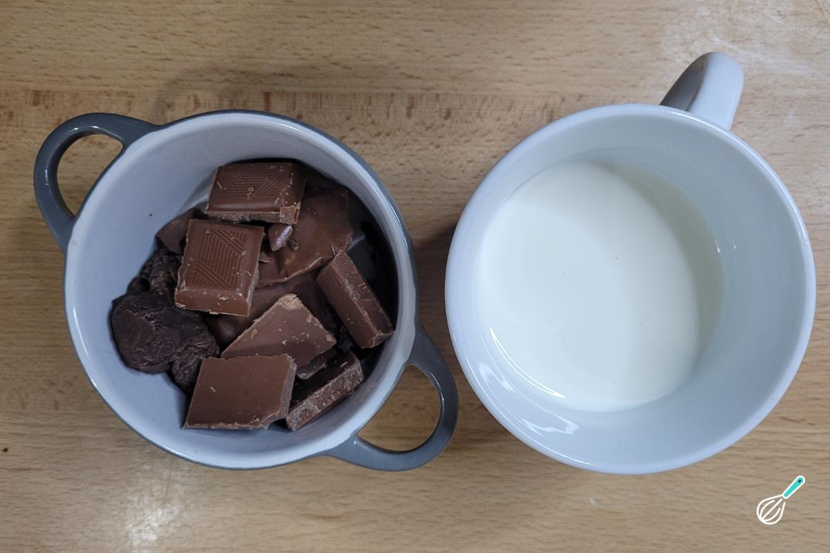 Separe os ingredientes para fazer a cobertura. Usei chocolate meio amargo picado, para equilibrar o doce do recheio, mas pode escolher o chocolate que preferir.