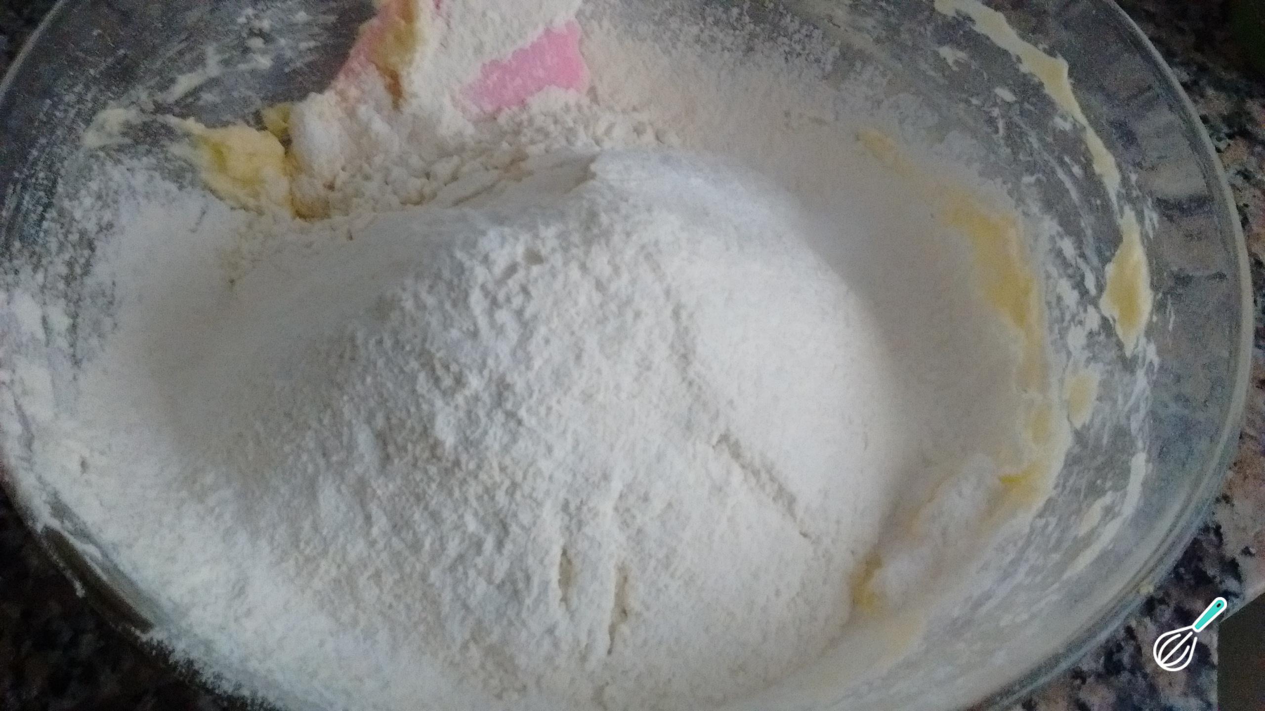 Em seguida, adicione a farinha com fermento previamente peneirada, juntamente com a pitada de sal, que realçará a doçura dessa receita. Se não tiver farinha com fermento, use a farinha normal e adicione 1 colher de sobremesa de fermento em pó junto com um quarto de colher de sobremesa de bicarbonato de sódio.