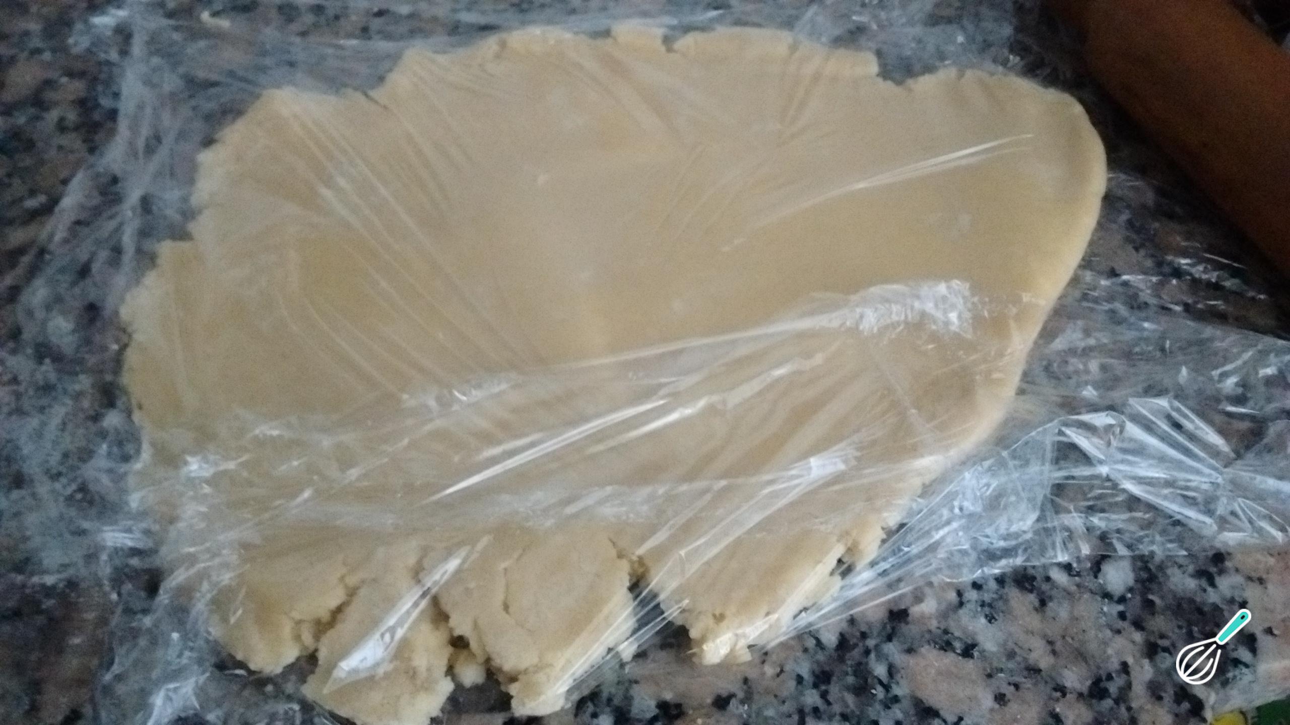 Integre os ingredientes da massa da torta de bombom com a ajuda da espátula, sem amassar. Remova para uma bancada limpa e coberta com filme plástico. Coloque outra folha de filme por cima e estenda a massa até a altura de 1 dedo. Coloque-a na geladeira em um prato, bandeja ou tábua reta por cerca de 30 minutos.