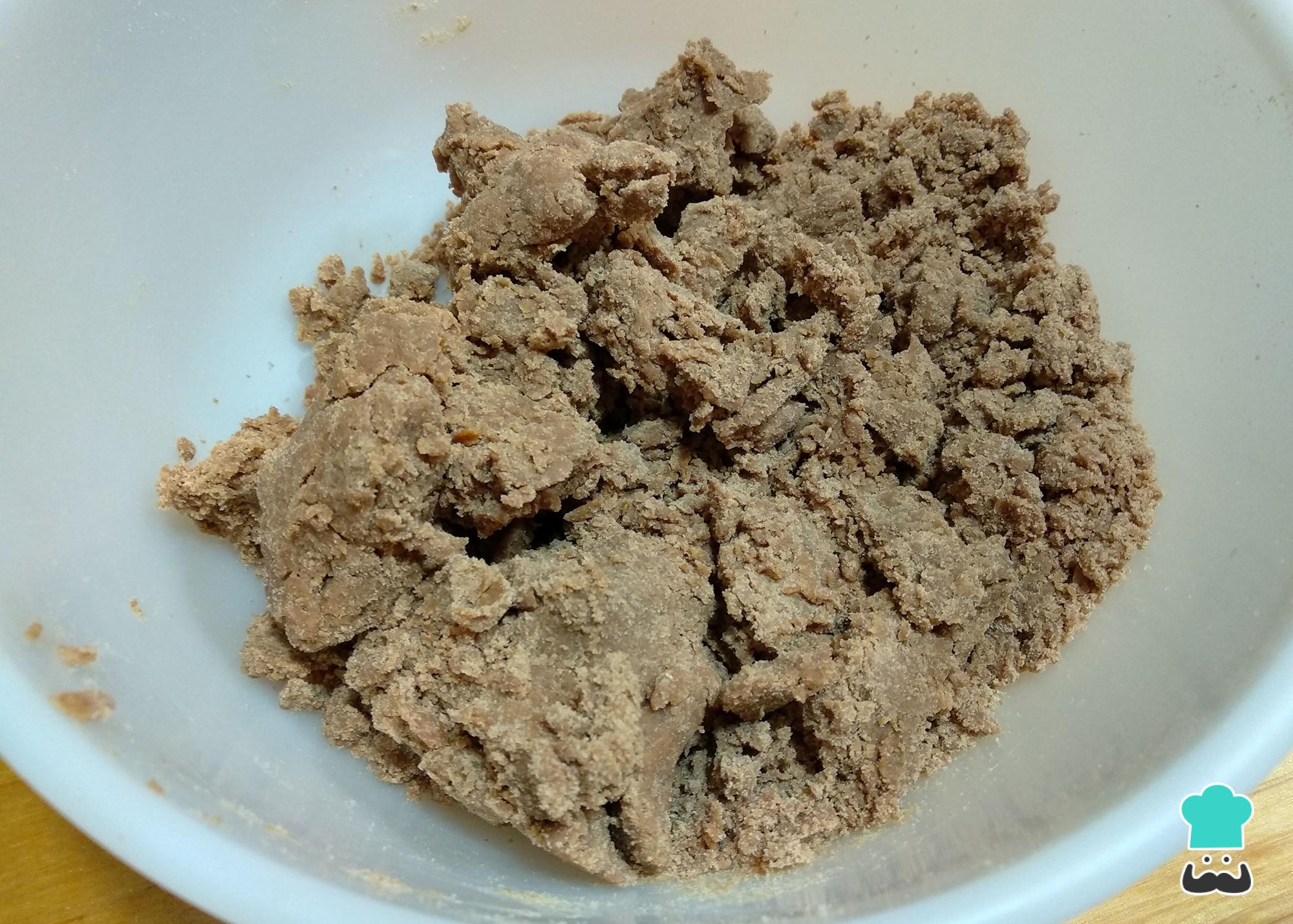 Prepare a base da torta misturando com as mãos a farinha, o chocolate, o açúcar e a manteiga em uma tigela até virar uma farofa. Acrescente o ovo batido e amasse até virar uma massa compacta e fácil de abrir sem quebrar.