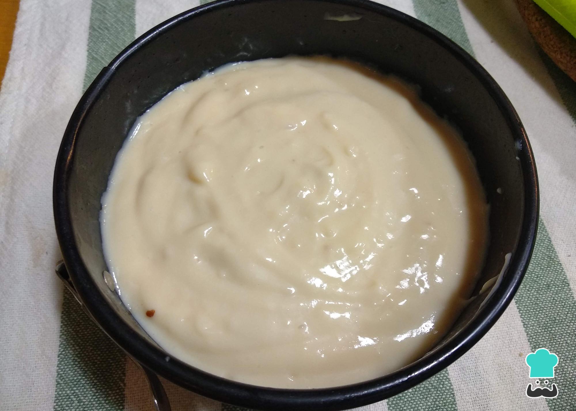 Enquanto isso prepare o creme branco: dissolva a maisena no leite e leve ao fogo junto com as gemas e o leite condensado. Fique mexendo e deixe ferver por 2-3 minutos, para virar um creme bem espesso. Depois adicione o recheio dos bombons, mexa até dissolver e desligue o fogo. Deixe esfriar até ficar em temperatura ambiente.