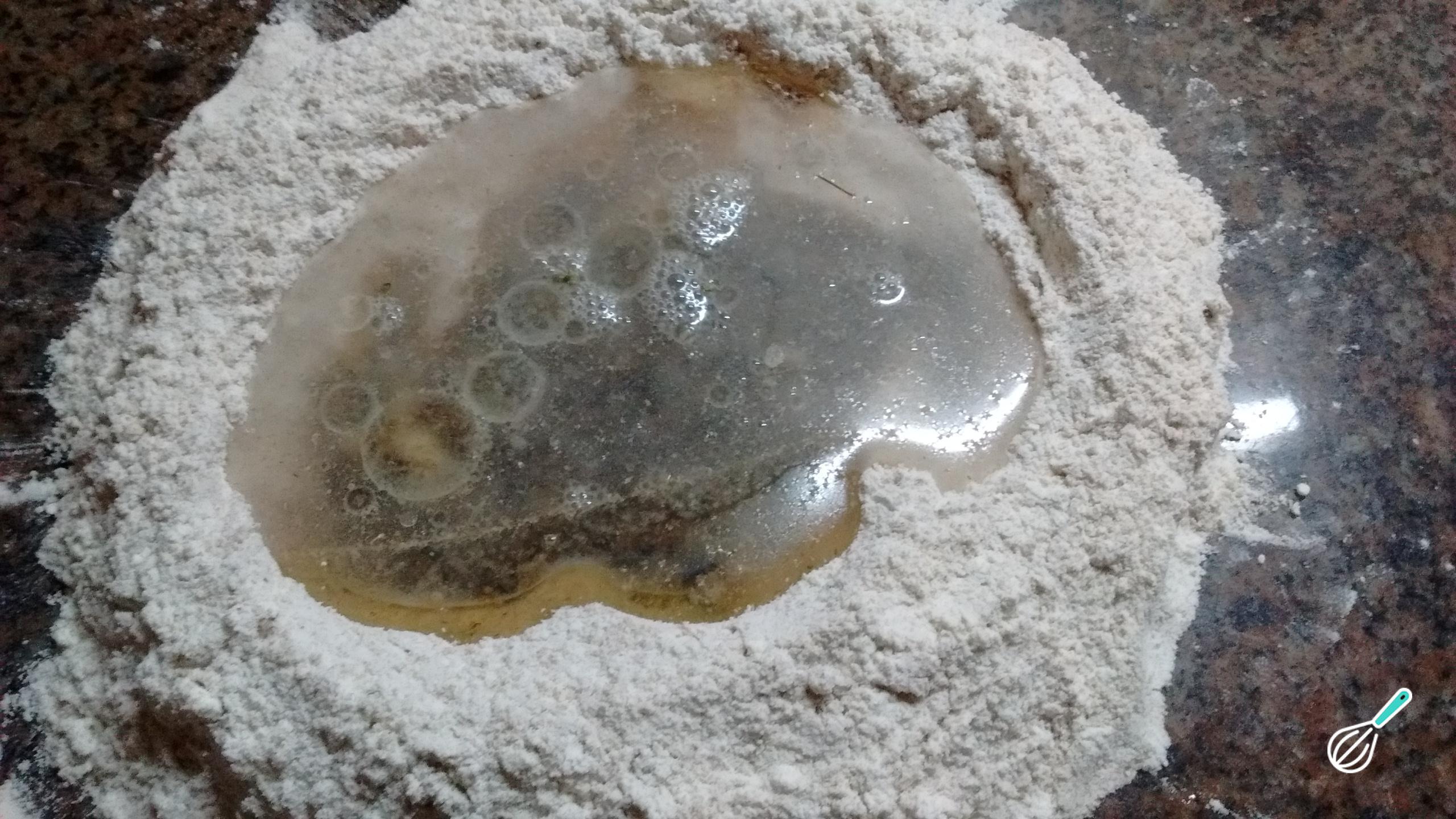 O primeiro passo para fazer a sua torta de brócolis e cebola é preparar a massa. Misture os dois tipos de farinha com os temperos e faça um circulo na mesa com um buraco no meio. Em seguida, coloque o óleo e a água no centro.