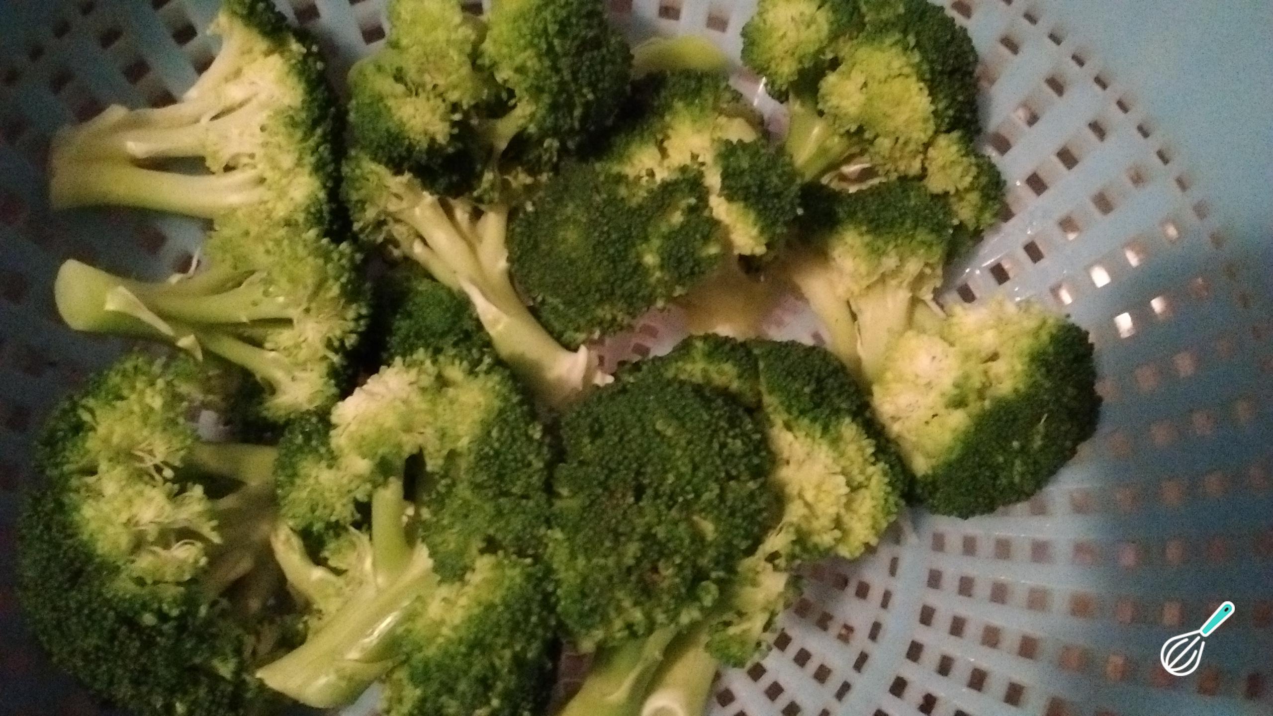 Em seguida, aqueça a água em uma panela. Separe o brócolis e coloque na água assim que ferver. Deixe-os por 1 ou 2 minutos, coe e esfrie eles com água fria, reserve.