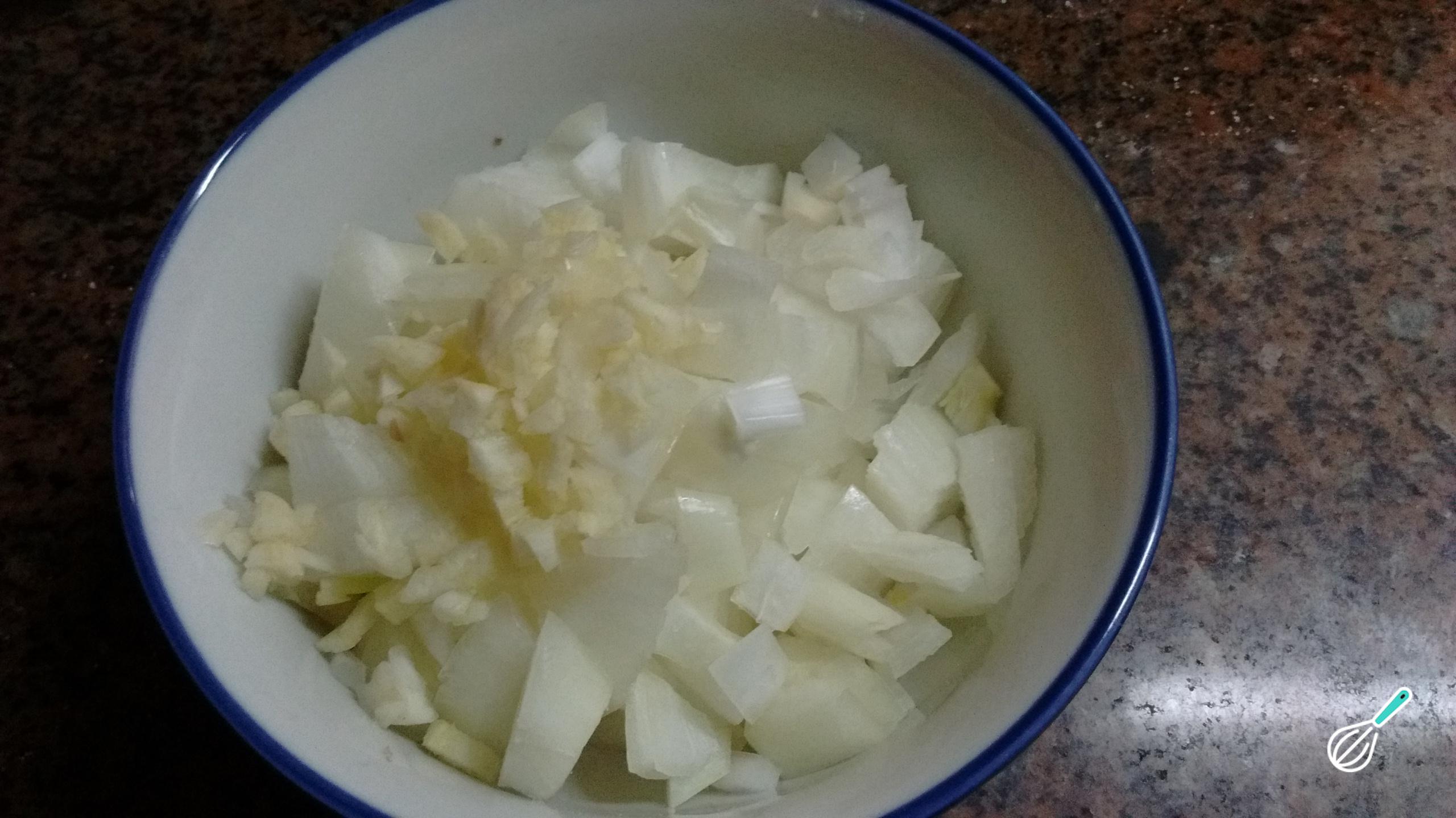 Aqueça uma colher de sopa de azeite em uma panela e refogue a cebola e o alho. Quando dourarem, dissolva o amido de milho no leite e despeje na panela. Mexa até engrossar. Desligue o fogo e tempere.
